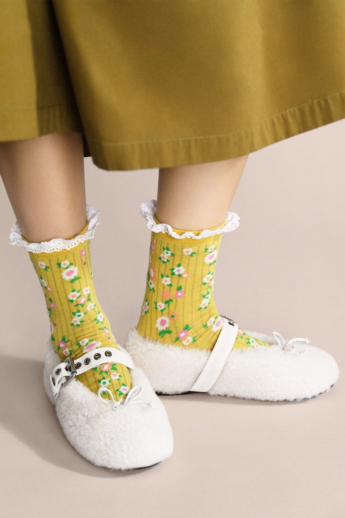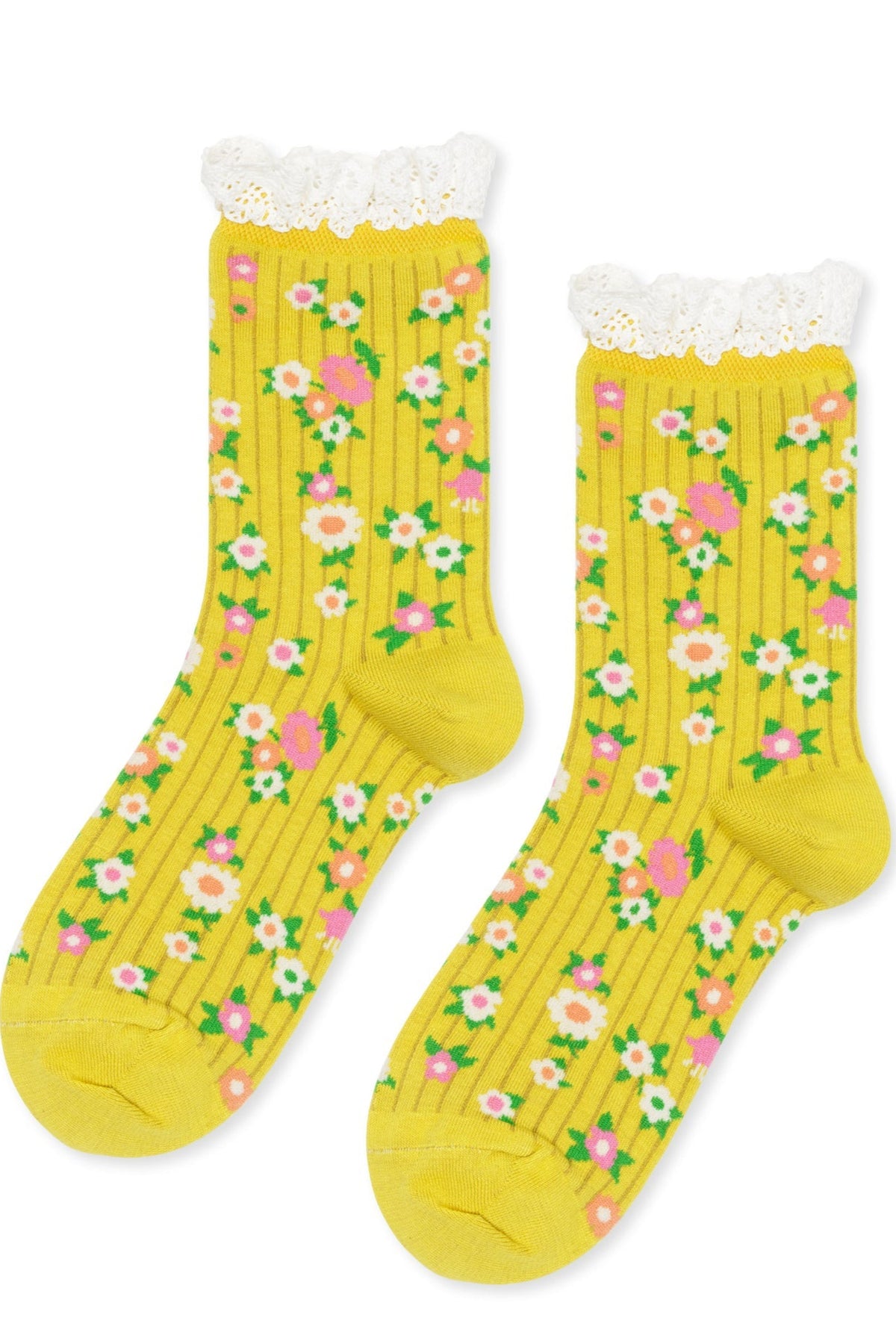 Get ready to bring some vintage vibes to your look! The Mellow Yellow Crews are bursting with retro colors and a fun lace cuff.