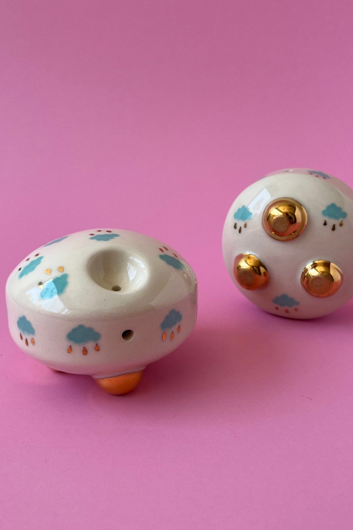 This piece is hand painted with a blue cloud pattern, gilded with gold lustre raindrops and fired 3 times in Anna's tiny 1.5 sq foot kiln on Agricola Street.