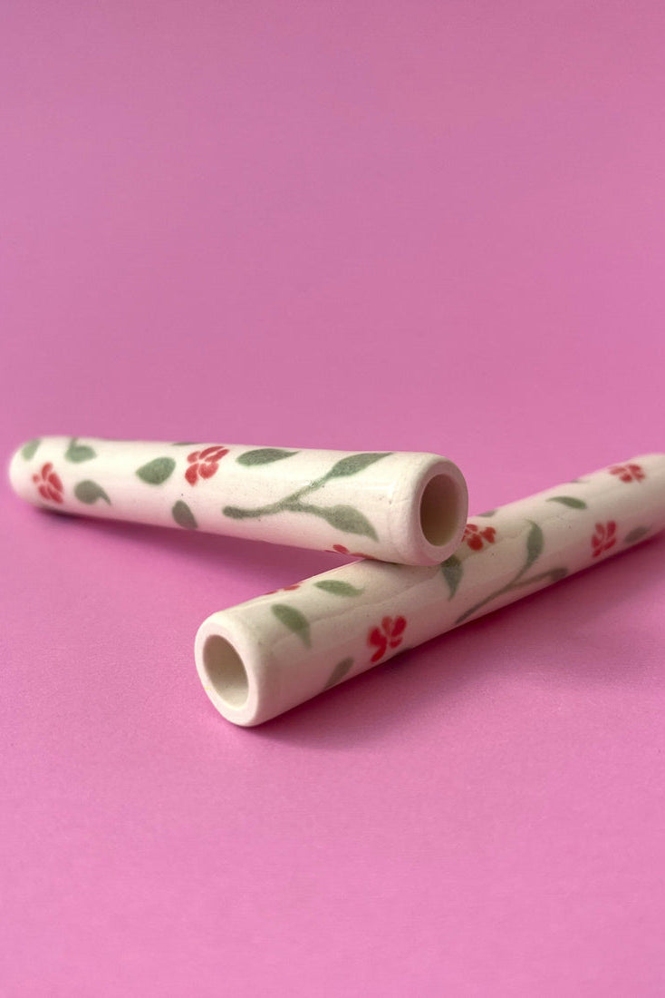 Handmade in the style of a one hitter pipe but with a larger bowl big enough to fit bud for two or three hits. This ceramic pipe is made from food safe, high fire ceramics. It is glazed inside and out making it easy to clean. She packs a perfectly sized punch but is small enough to pop in your pocket.