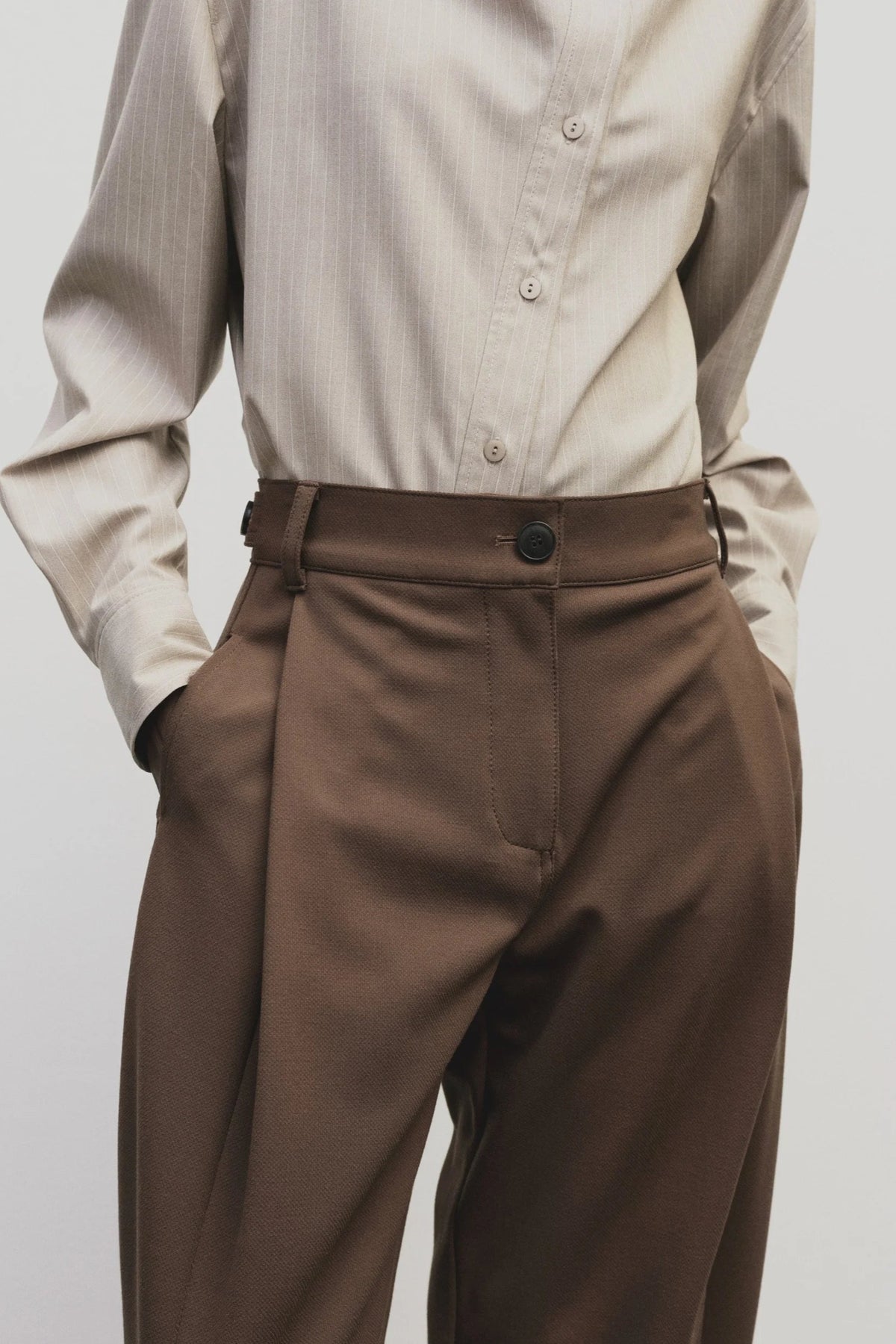 A mid to heavier weight stretch woven fabric with a relaxed silhouette. Mid rise with a front pleat front detail. Side pockets with adjustable button waistband.