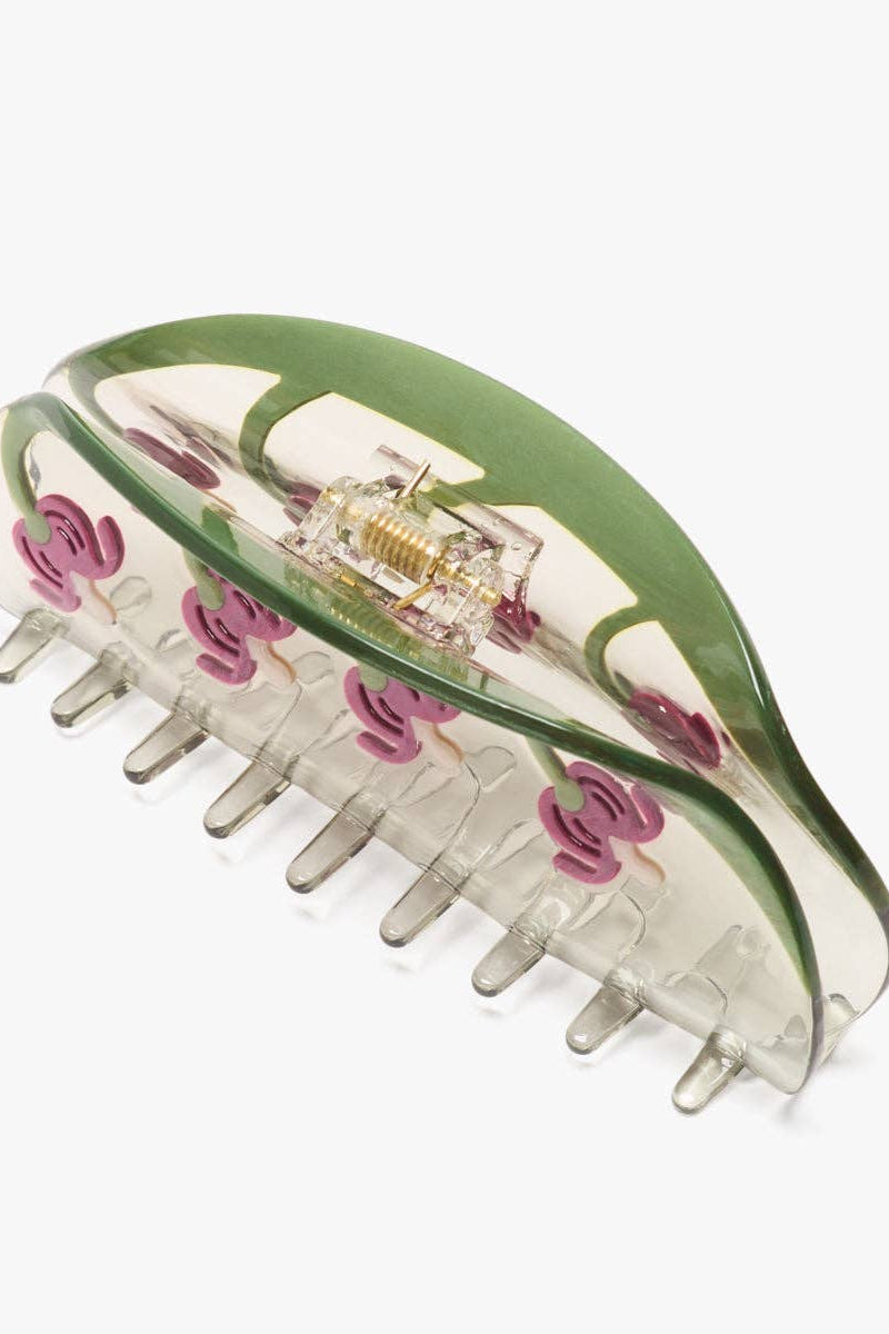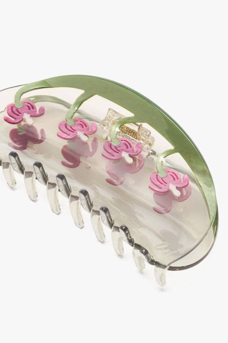 A clear smoked acetate clip with a string of bleeding hearts to adorn and keep your hair in place.