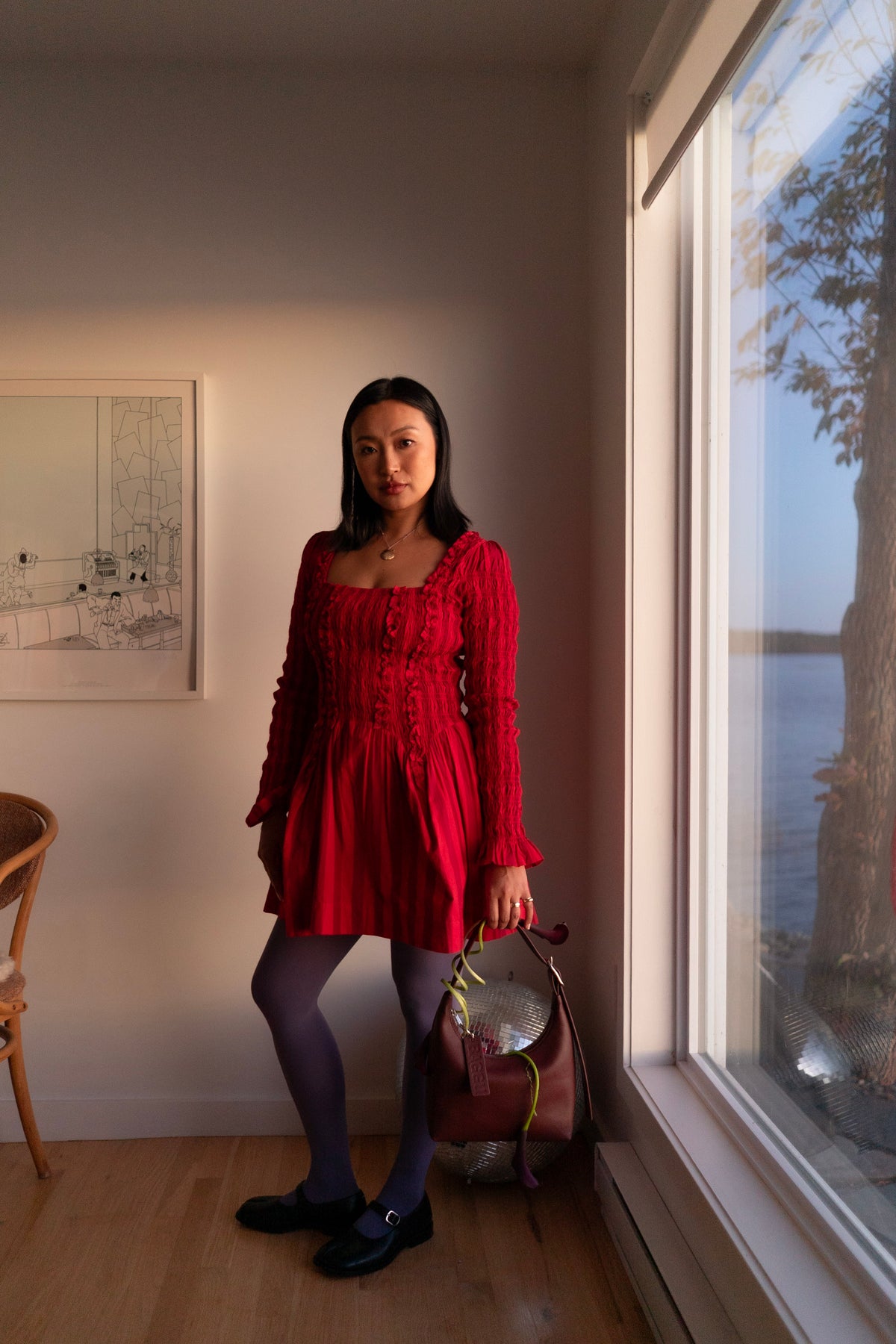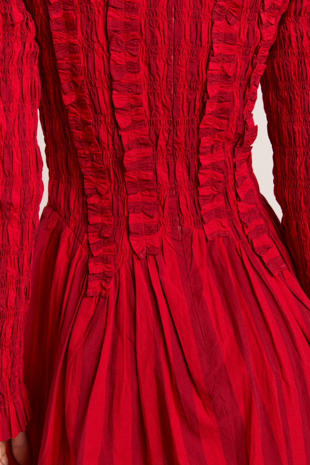 Flirty and fun and everything in between! The Raphaela Mini Dress is sewn from DM's signature red and burgundy stripe cotton, complete with ruffle detailing and a shirred bodice for a flattering fit. She's a mini length with a zippered back and side seam pockets of course.