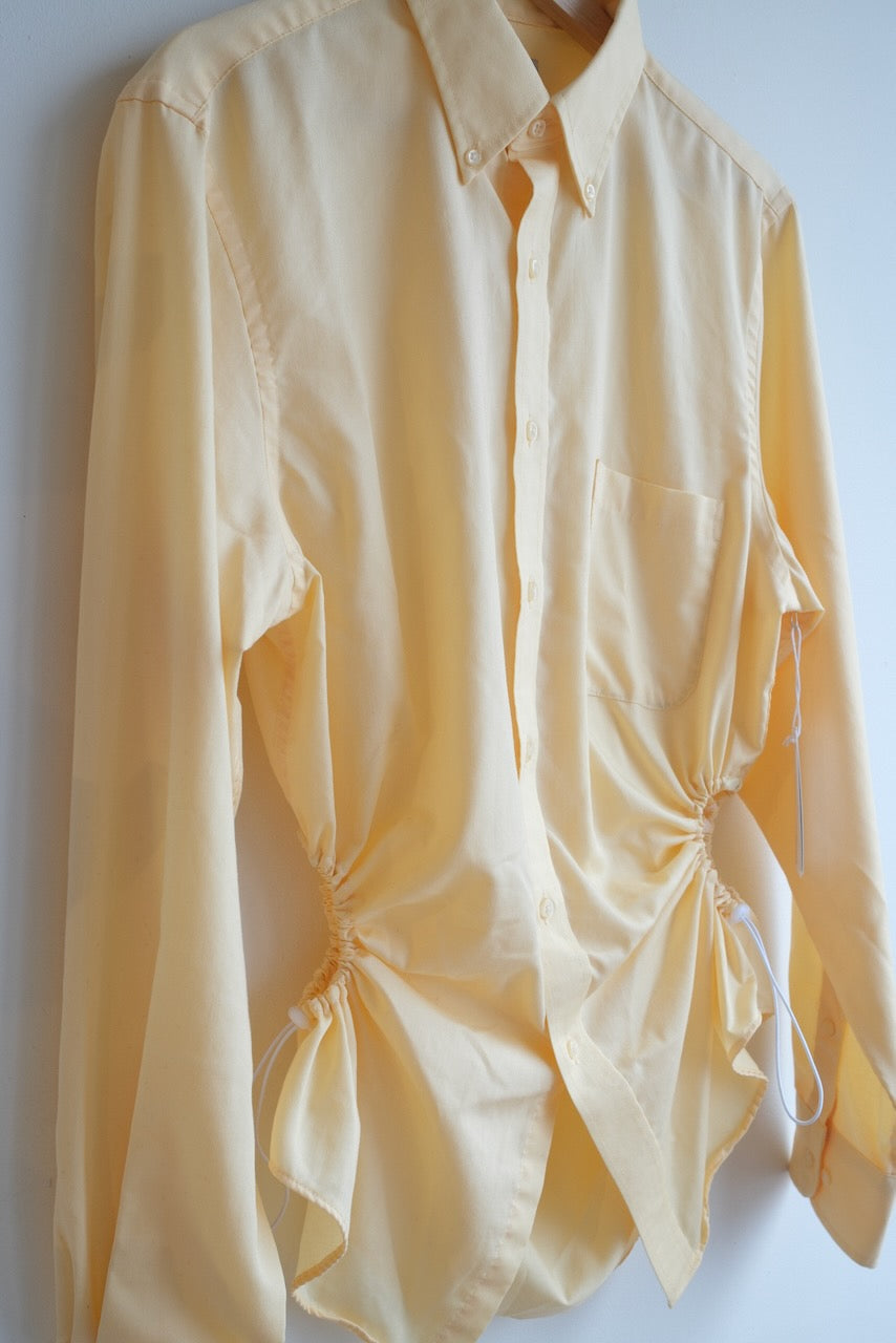 A classic reimagined. This one-of-a-kind vintage men's dress shirt is a modern update with side cut outs and an adjustable bungee cord that cinches the waist for a customizable fit. Crafted in Vancouver, Canada from vintage cotton or cotton-blend shirting, each piece is sustainably upcycled — honoring the shirt's original structure while redefining it with a fresh silhouette.