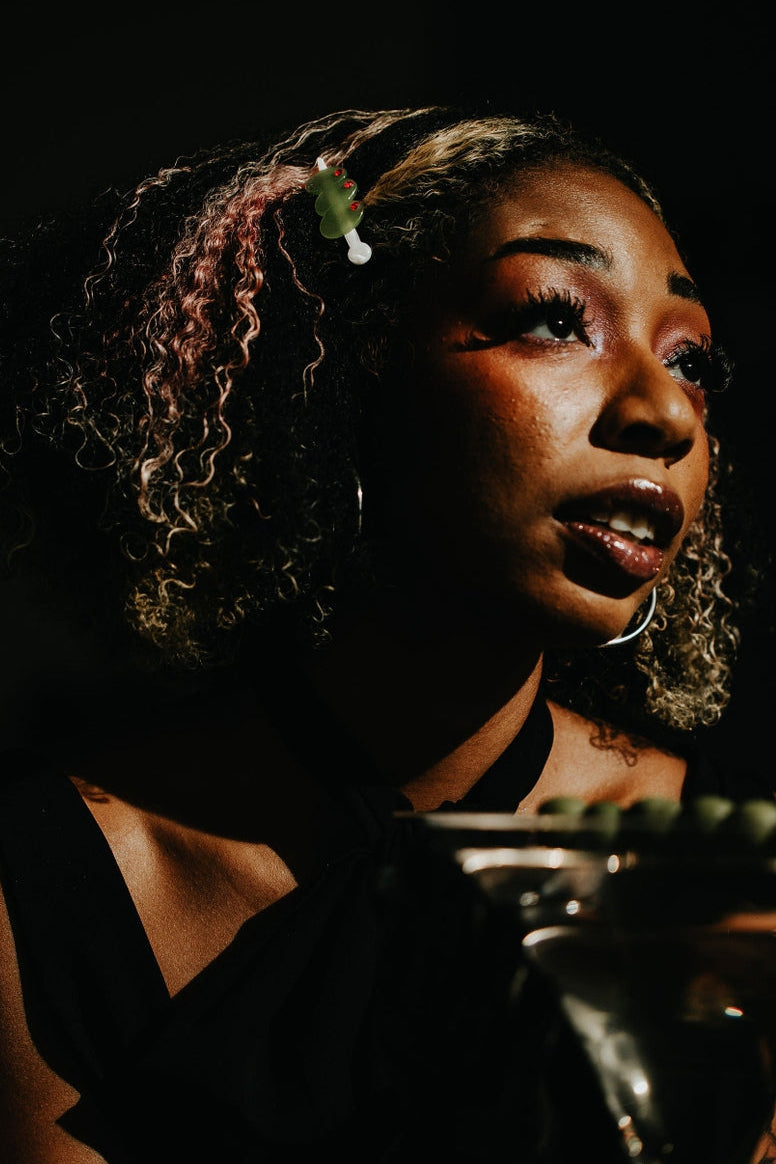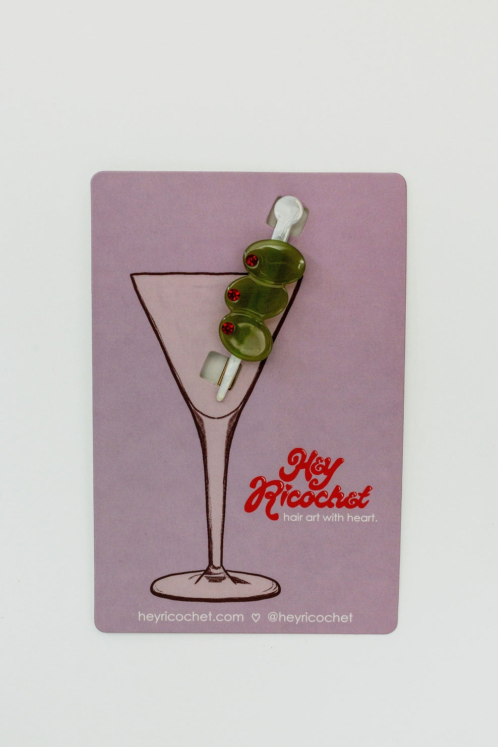 Stirred to perfection. The Extra Dirty Clip features 3 raised green olives on a shiny silver pick with a red pimento gem.