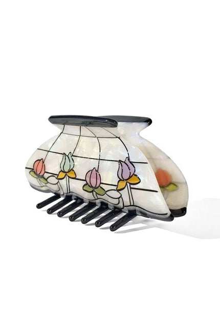 Travel back in time to nan's living room with the Flower Garden Lamp Claw, inspired by vintage stained glass lamp design. Featuring pastel flowers against an iridescent background with black engraving lines to mimic stained glass.