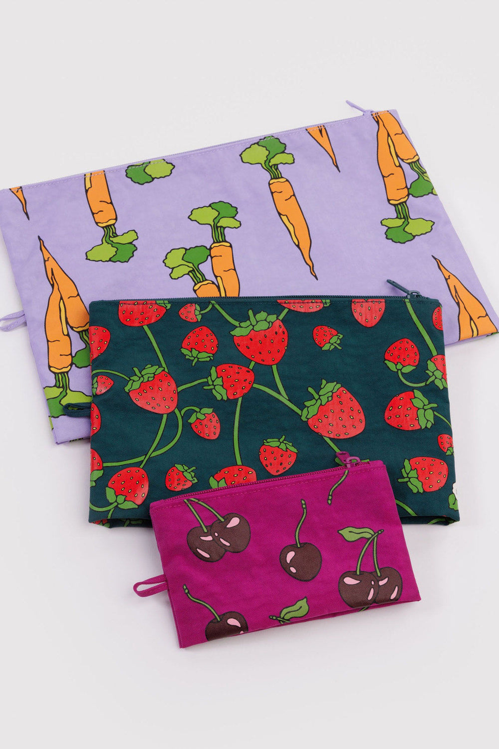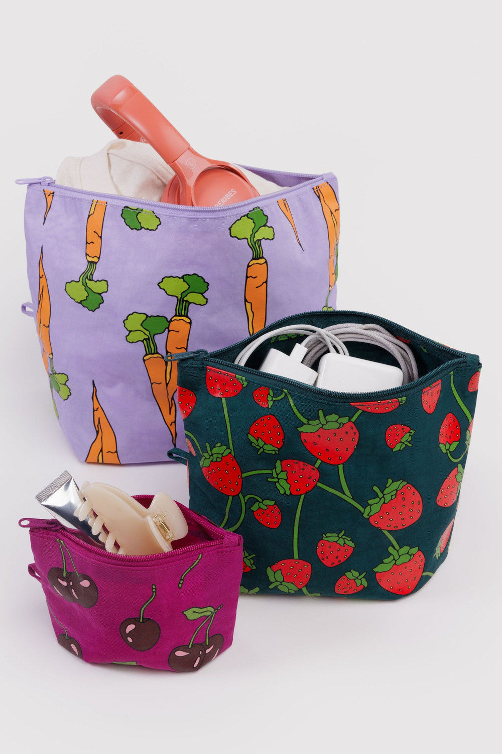 Baggu Go Pouch Set makes it easy to keep your bag neatly packed and organized. Whatever you're toting—coins, cords, or an extra pair of shoes—this set of three all purpose pouches keeps it together. They expand to hold your essentials and lay flat when not in use.