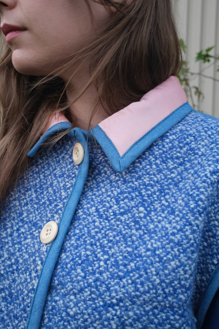 Made from mid weight vintage wool blankets, lined with unbleached cotton and bound with denim chambray. This car coat is flexibly sized with a drop shoulder and side slits to accommodate a range of sizes from an oversized small to a fitted medium.