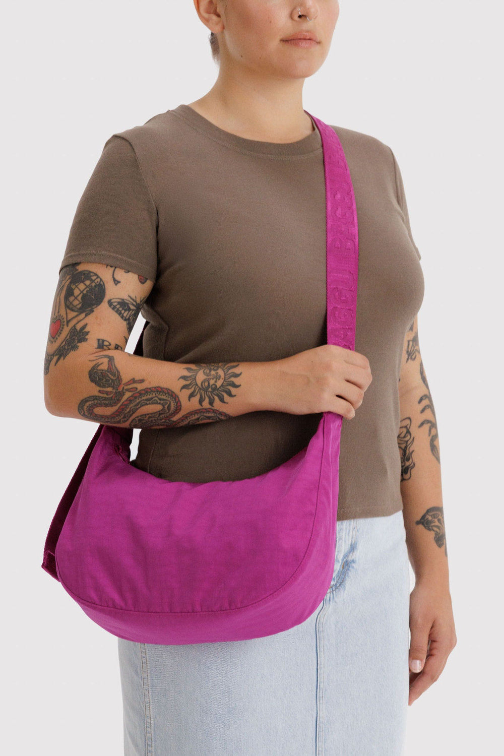 Practical doesn’t have to be boring. Baggu's Medium Nylon Crescent Bag is effortlessly casual and large enough to carry more than just the essentials. Wear it slung over your shoulder or crossbody for a hands-free experience. Complete with two interior pockets that make it easy to stay organized and internal black logo key leash & metal carabiner.