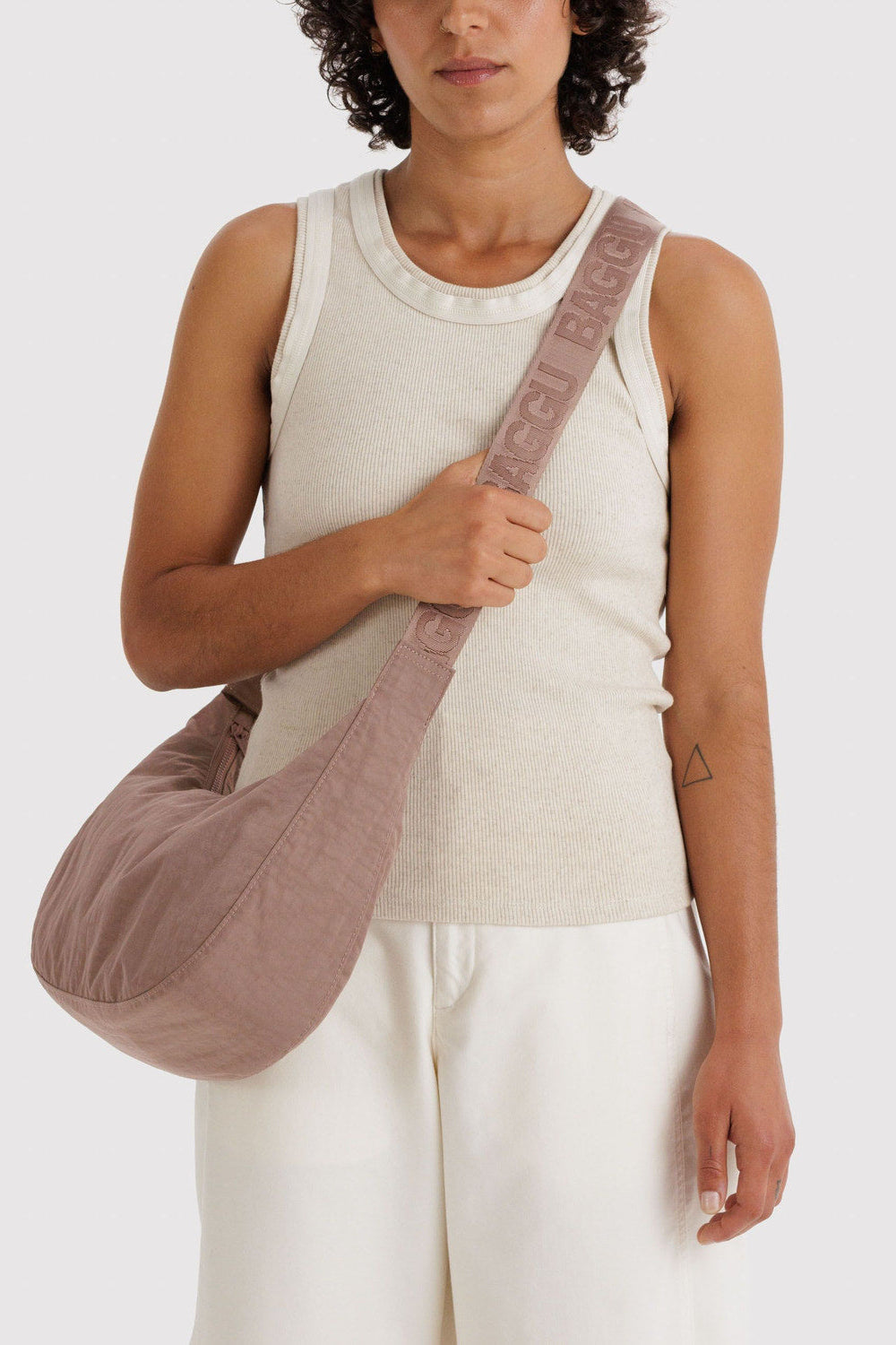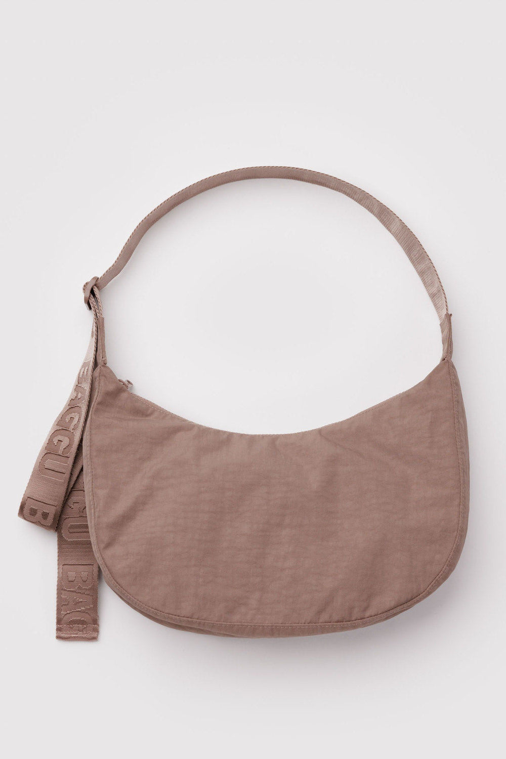 Practical doesn’t have to be boring. Baggu's Medium Nylon Crescent Bag is effortlessly casual and large enough to carry more than just the essentials. Wear it slung over your shoulder or crossbody for a hands-free experience. Complete with two interior pockets that make it easy to stay organized and internal black logo key leash & metal carabiner.