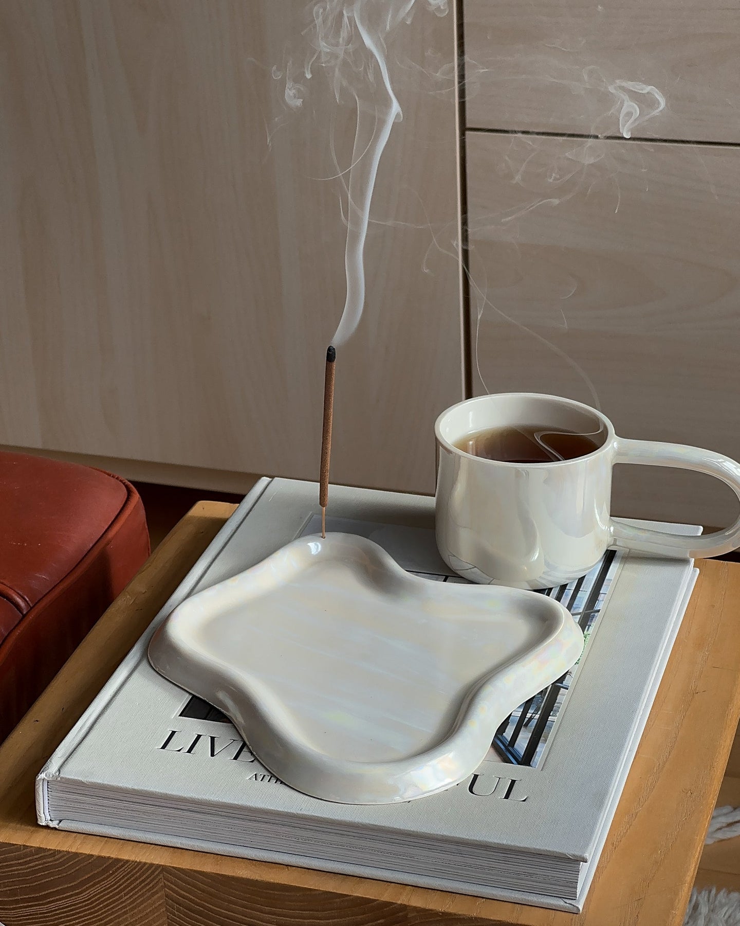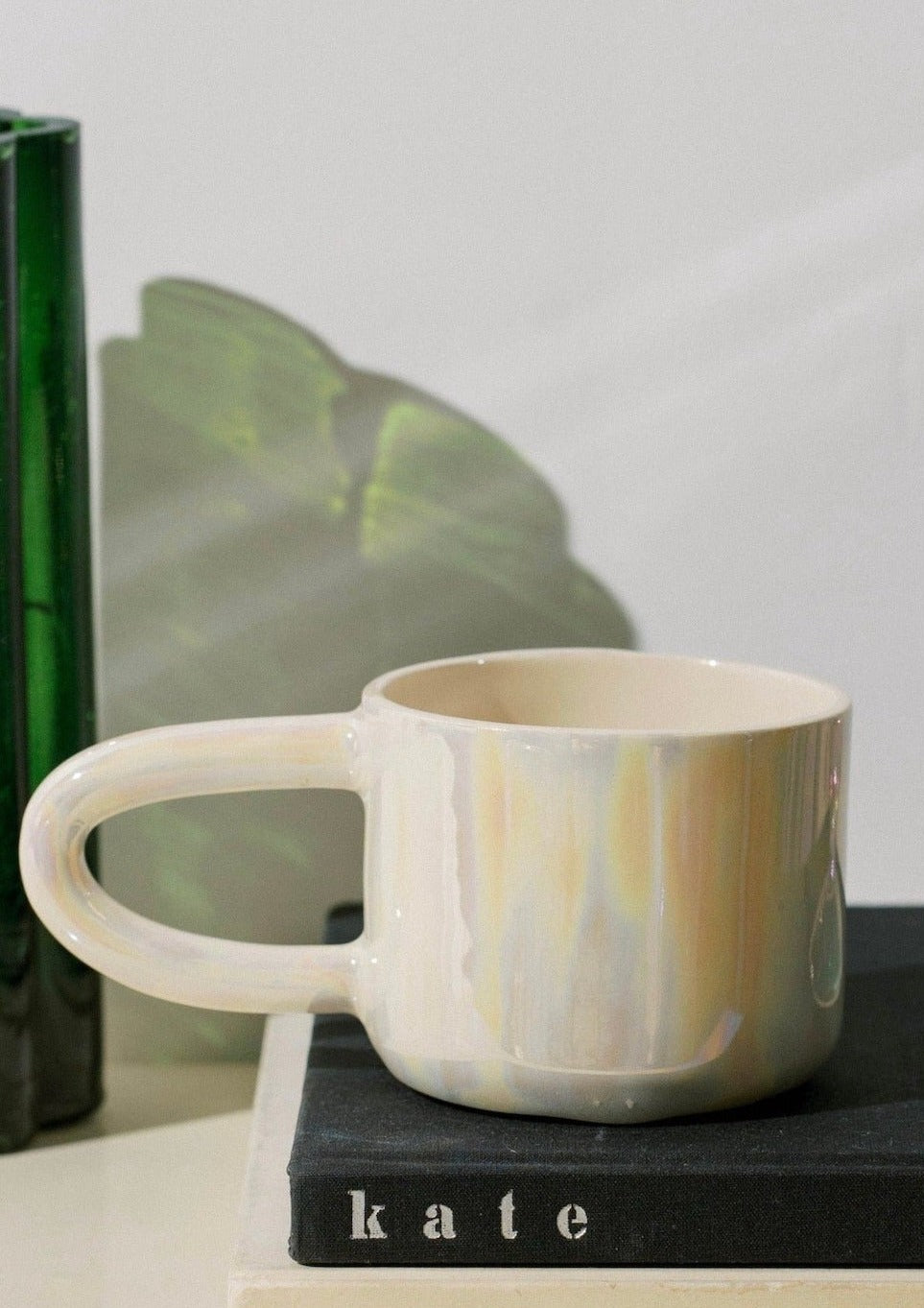 This handmade ceramic mug features an elongated handle that feels both sculptural and comfortable in hand. Finished with a fully glazed pearlescent surface, it catches the light with a soft, luminous sheen. It holds approximately one cup of liquid—perfect for a slow morning or an afternoon pause. Each mug is one of a kind.