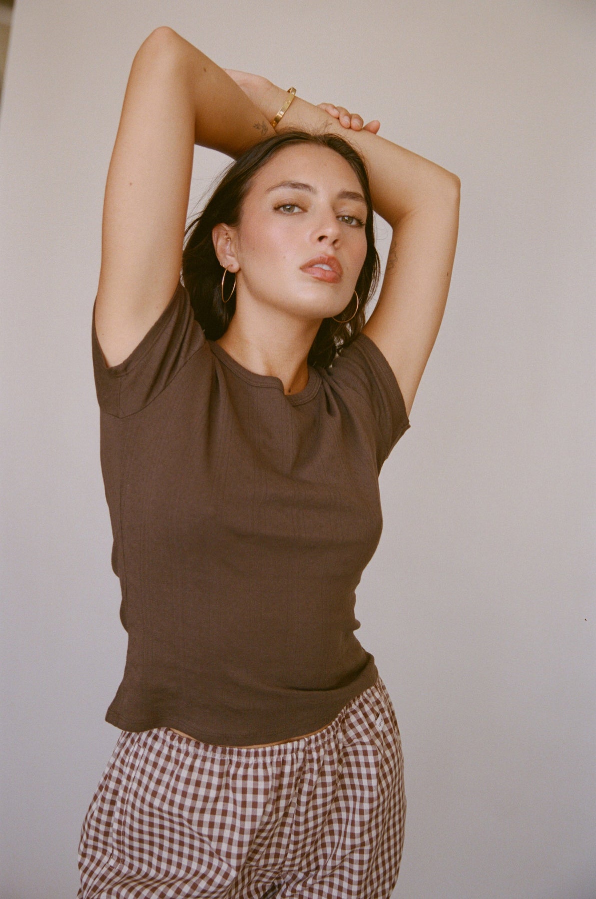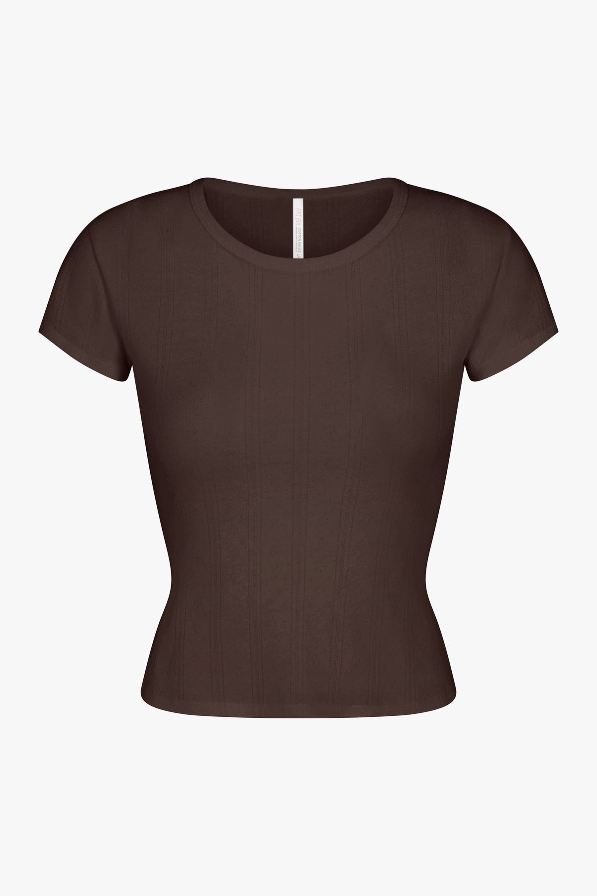 Meet the Perfect T-shirt—slightly fitted, mid-length, and designed to hug you in all the right places. It’s soft, breathable, and hits just above the hips for a flattering everyday fit. Made in a- breezy pointelle, which is knit and sewn in LA and Rat Boi's signature cotton jersey, it’s an easy essential you’ll want to wear on repeat.