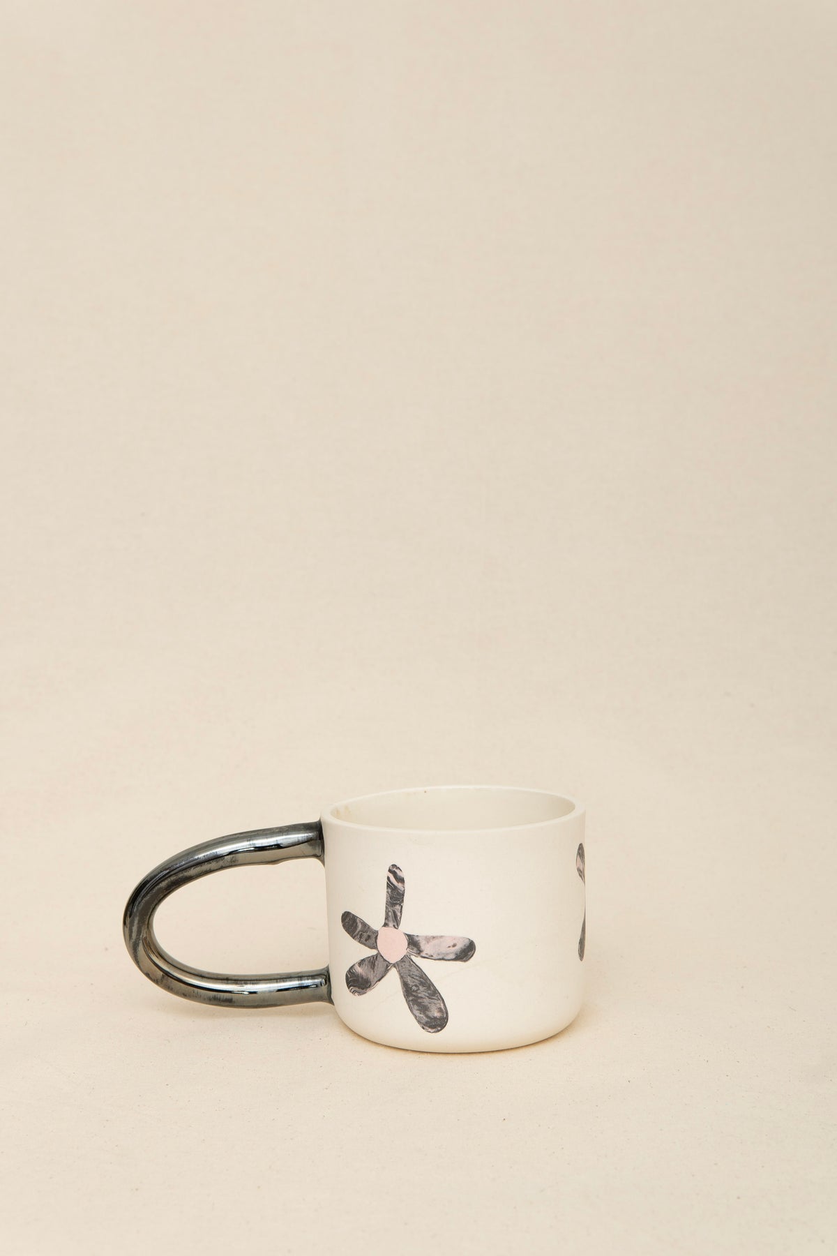 This handmade ceramic mug features an elongated chrome black handle that feels both sculptural and comfortable, fitting two fingers with ease. The interior is finished with a white glaze while the exterior contrasts with a matte white clay body with handmade marbled flower inlays. It holds approximately one cup of liquid, making it perfect for a slow morning or an afternoon pause. Each mug is one of a kind.