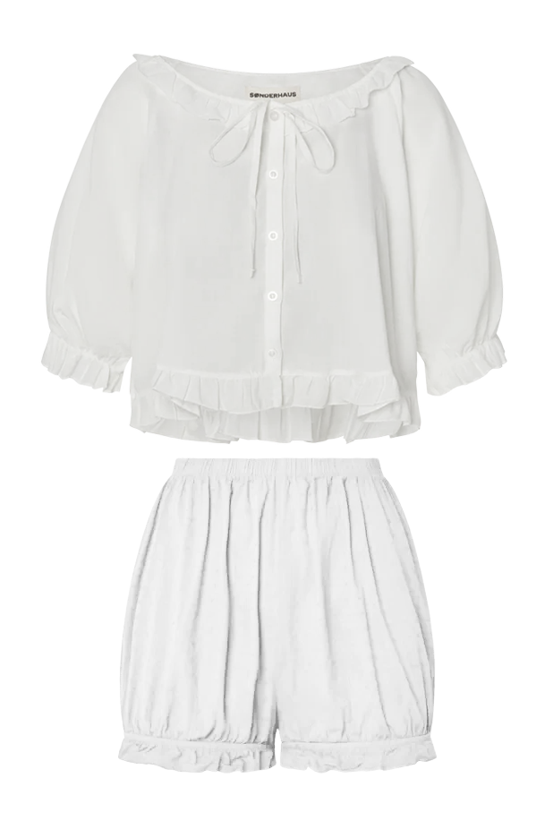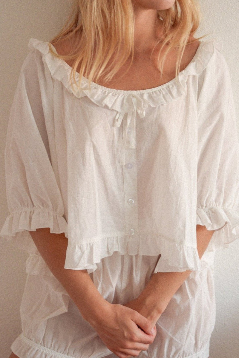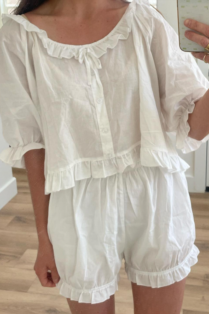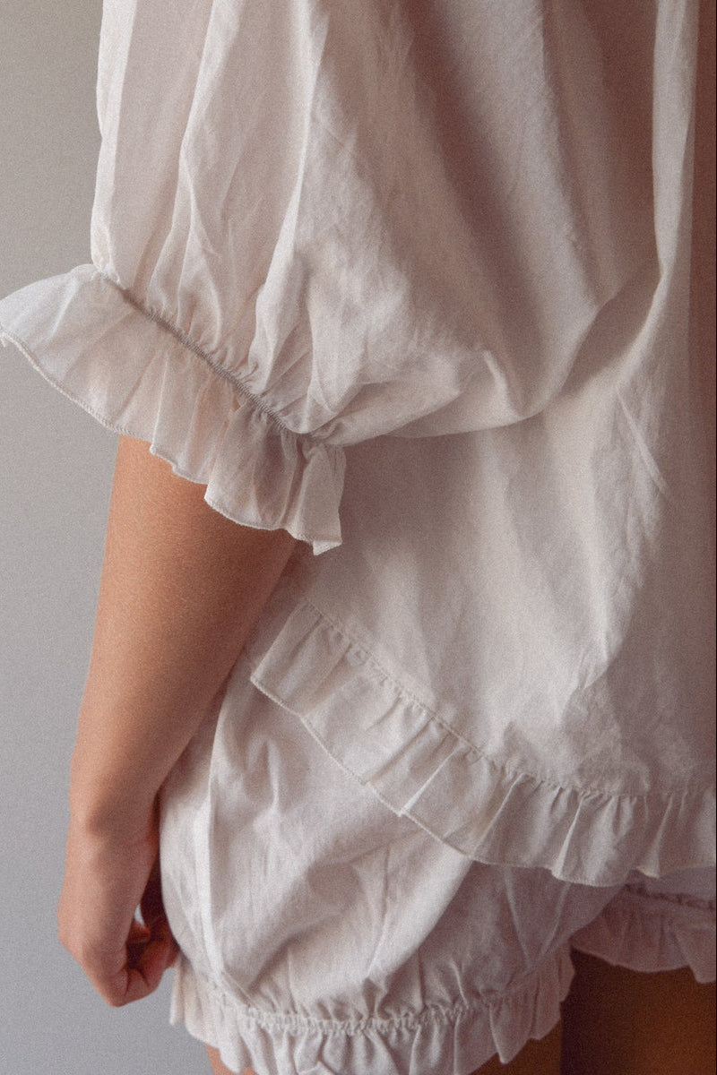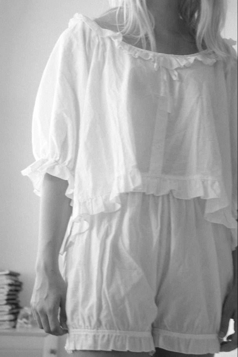 Inspired by romantic victorian and vintage edwardian sleepwear, the Romeo Sleep Set includes a pair of bloomer shorts and a flowy, cotton voile top. Designed to keep you cool and comfortable, and made to be worn as pyjamas or day wear. Sewn from 100% cotton voile, this set features trimmed ruffles, functional buttons, a thin tie around the neckline, and an elastic waist.