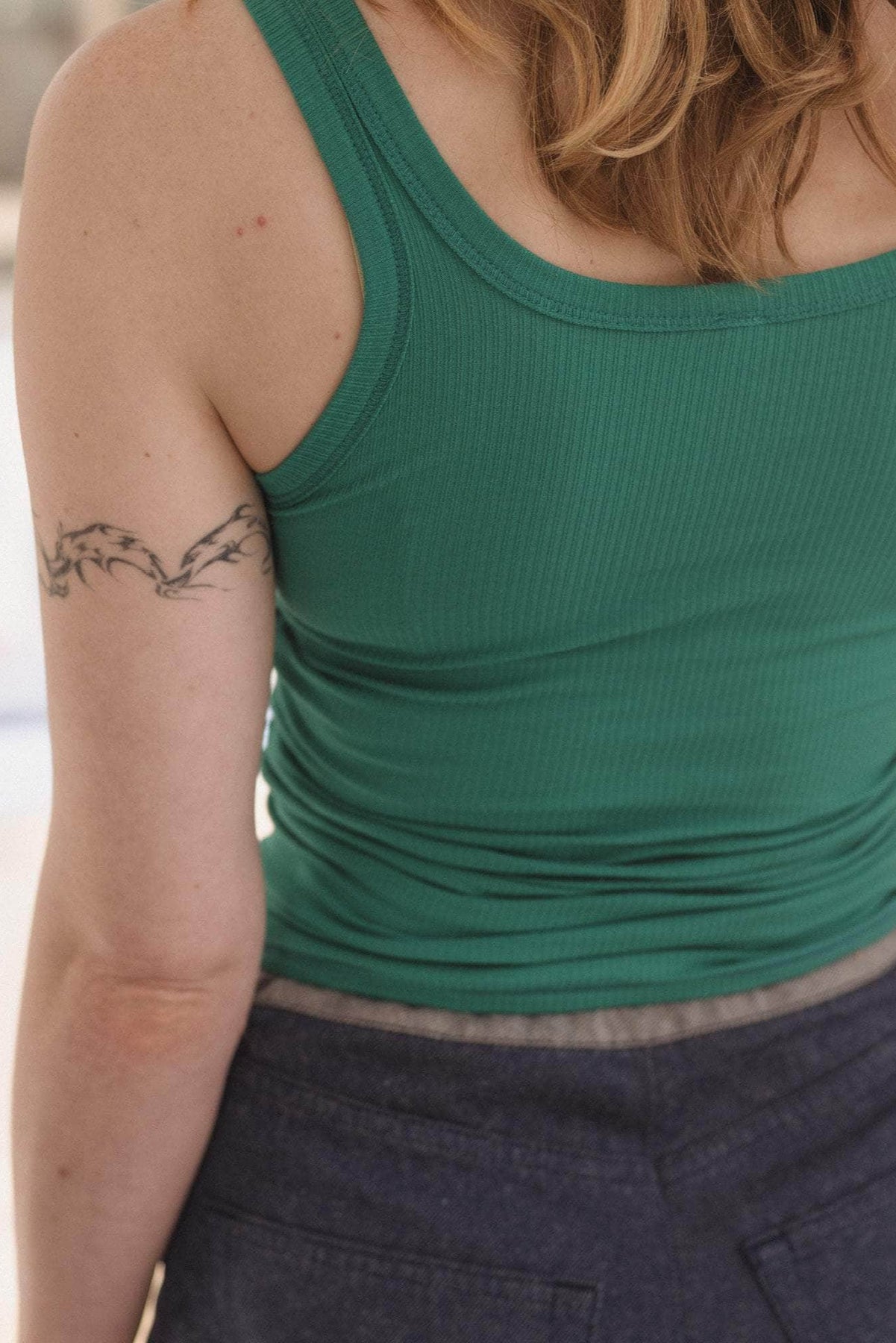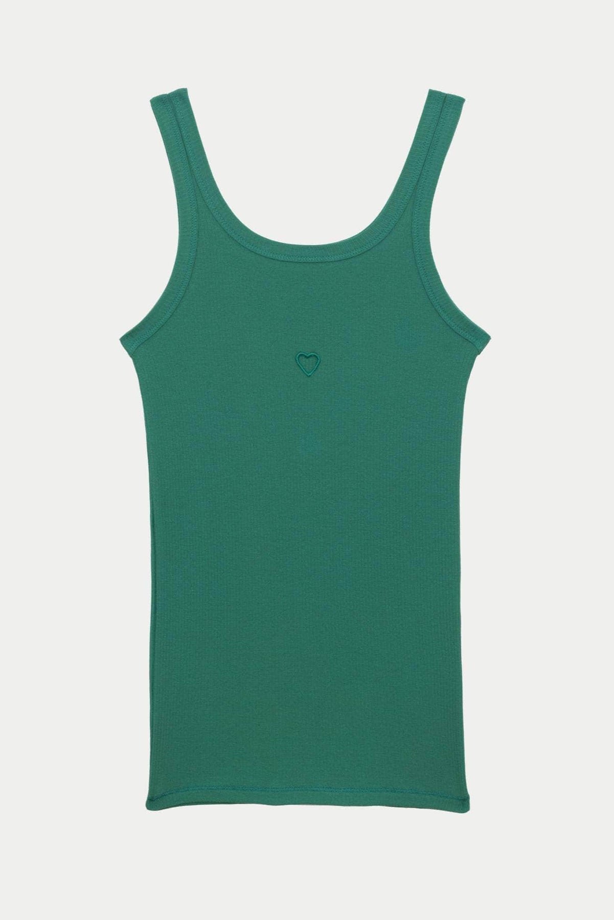 Ribbed organic cotton tank, with a scoop neck/back and heart cut-out. Form fitting and made for a lifetime of wear. We love this tank styled under a button down peaking out for a little added fun.