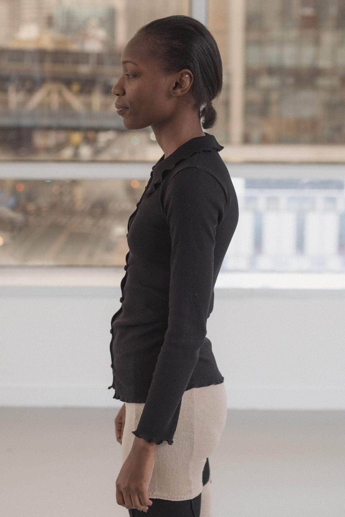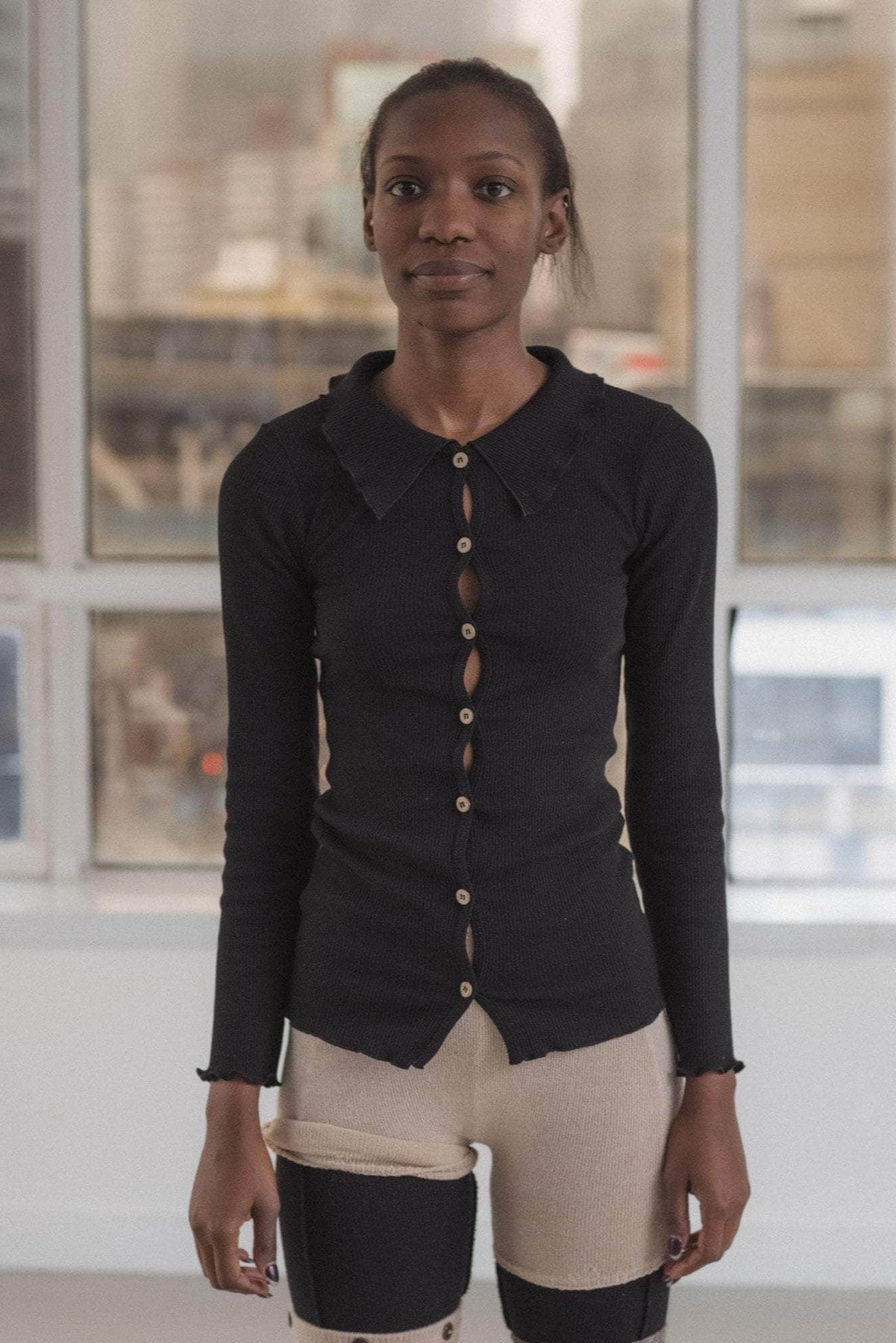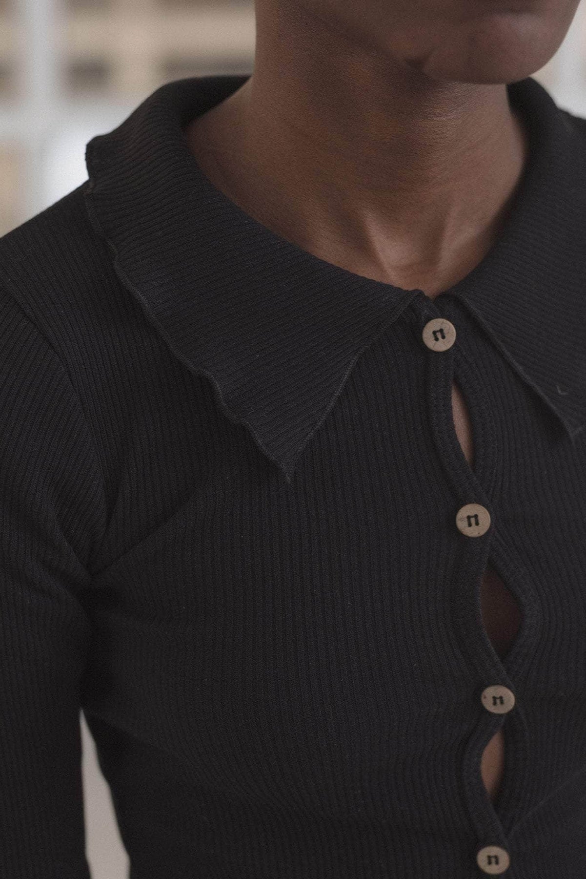 Recycled cotton rib fitted button-up shirt finished with a collar. Lettuce hem and sleeve, wear as a cardigan on it's own or layer over top your favourite tee.