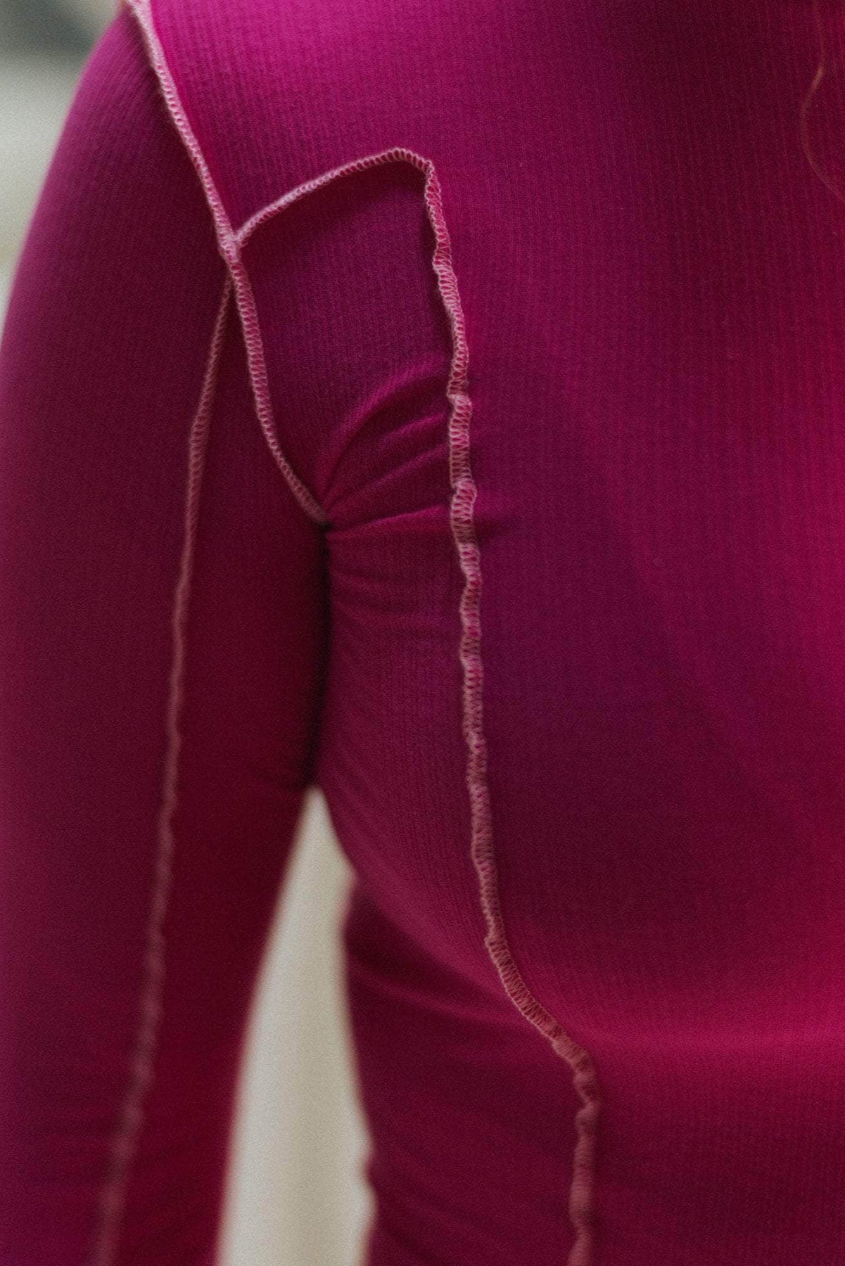 Baserange's signature organic cotton rib long sleeve tee in a rich magenta with exposed contrast stitching and a lettuce edge boatneck.Made in Europe.MATERIALS & CARE100% organic cottonDelicate wash cold, hang to dry SIZE & FITModel wears a size S