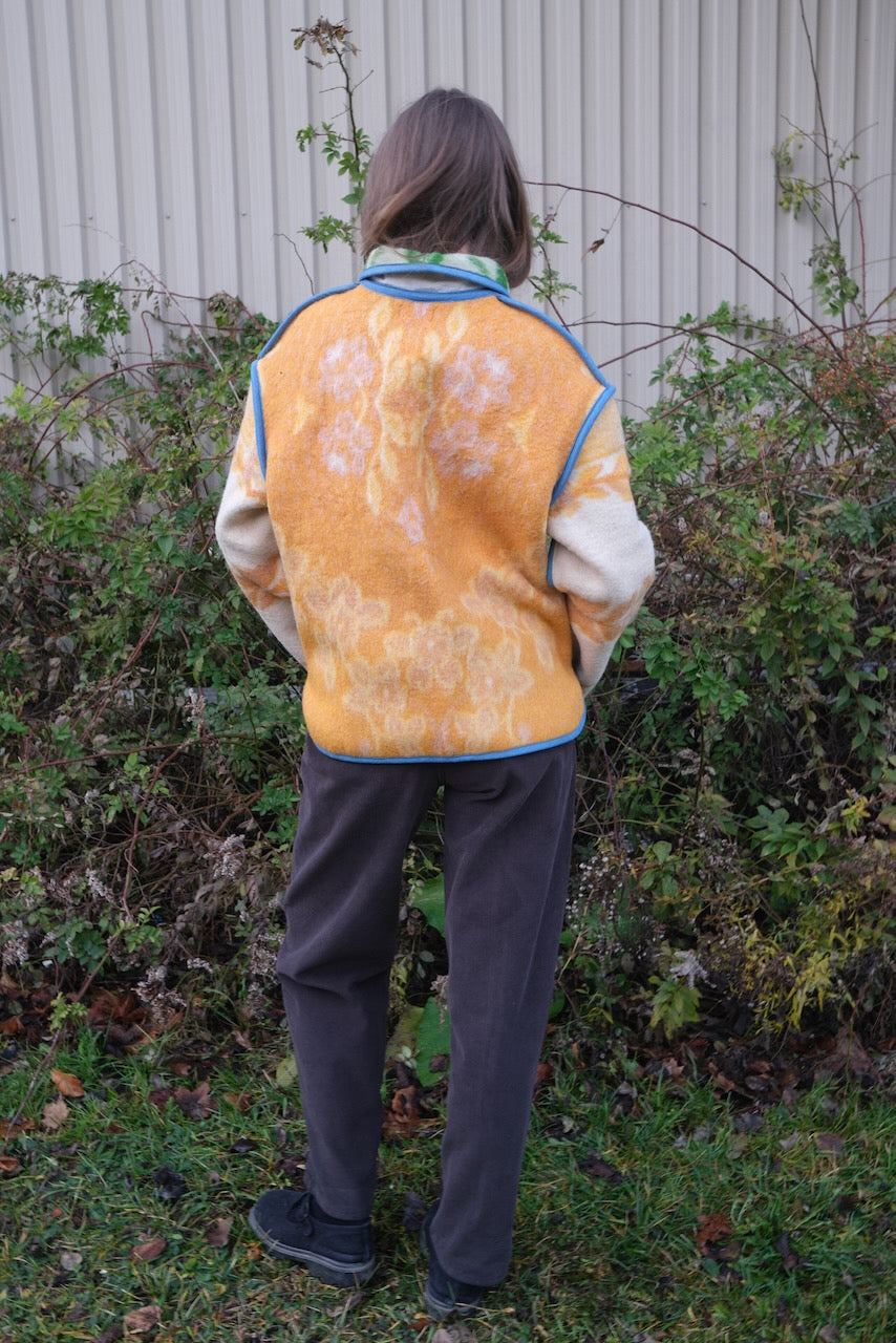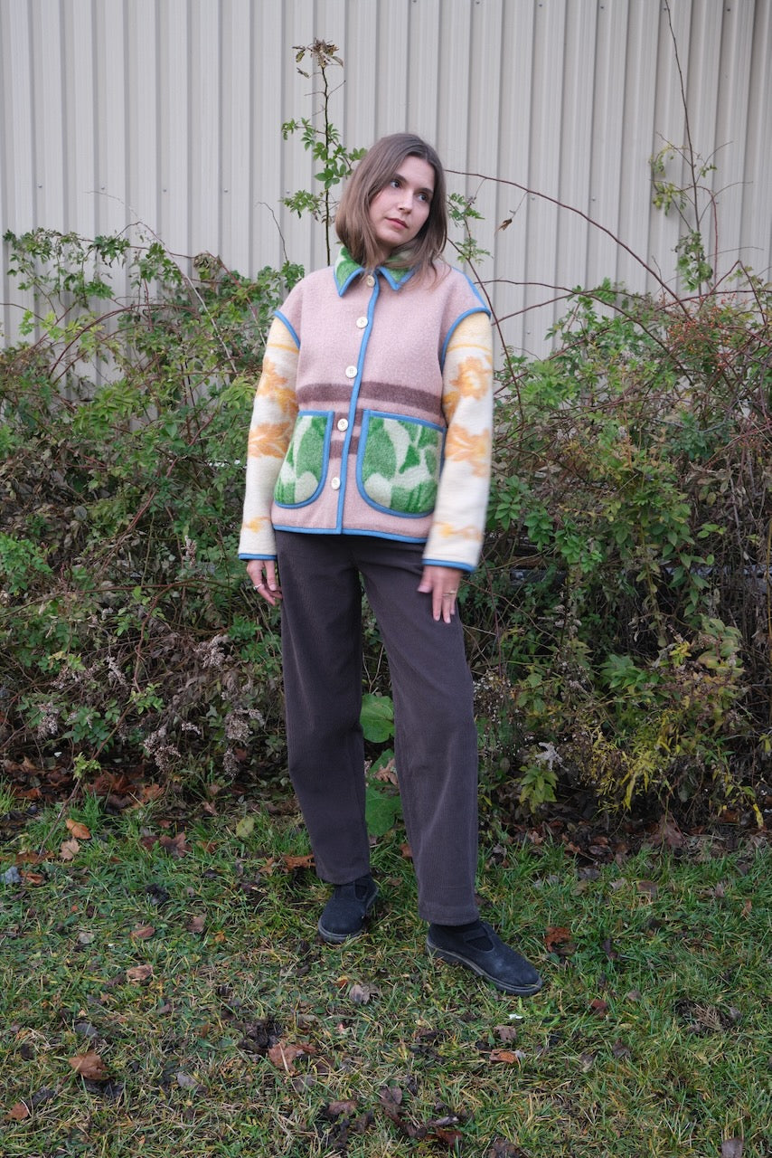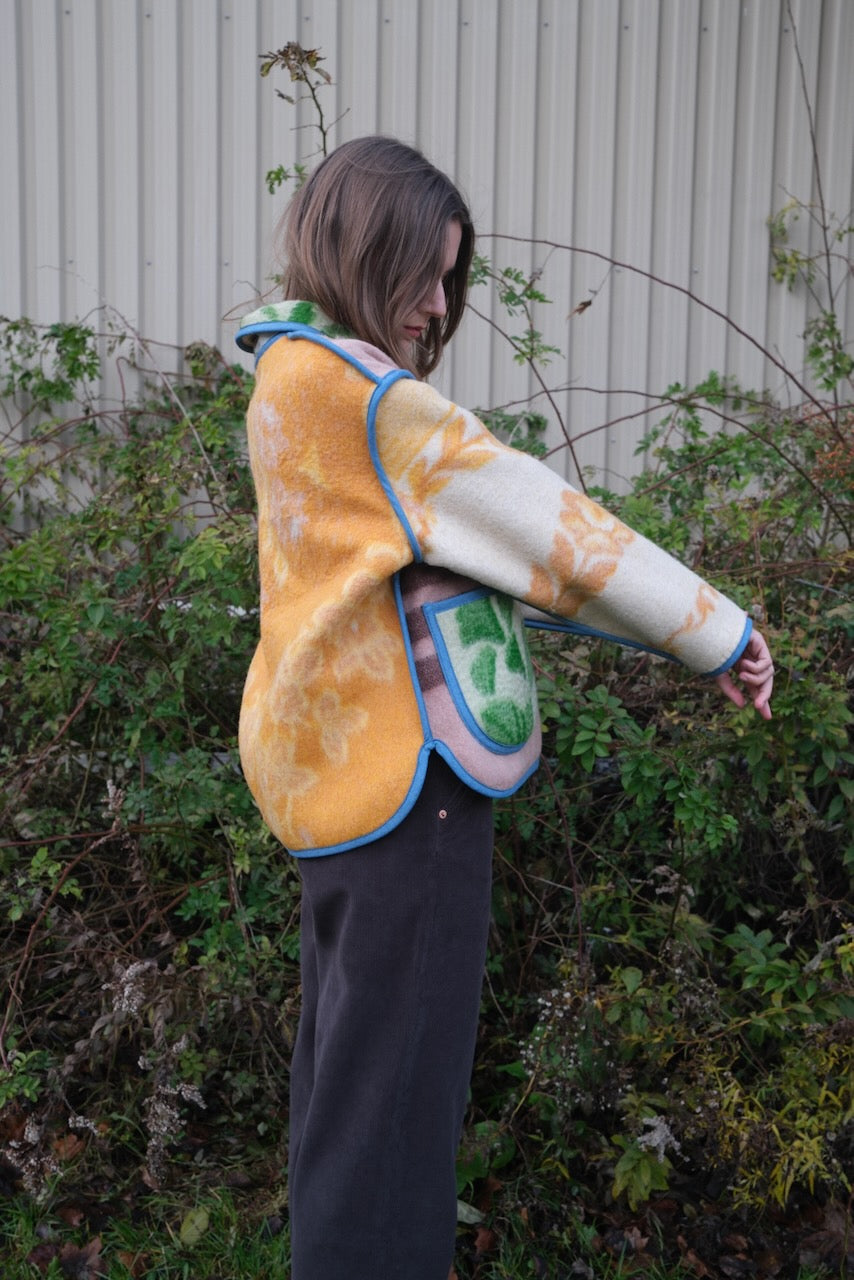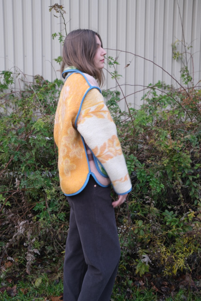 Made from plush vintage wool blankets, lined with unbleached cotton and bound with denim chambray. This car coat is flexibly sized with a drop shoulder and side slits to accommodate a range of sizes from an oversized medium to a fitted large.