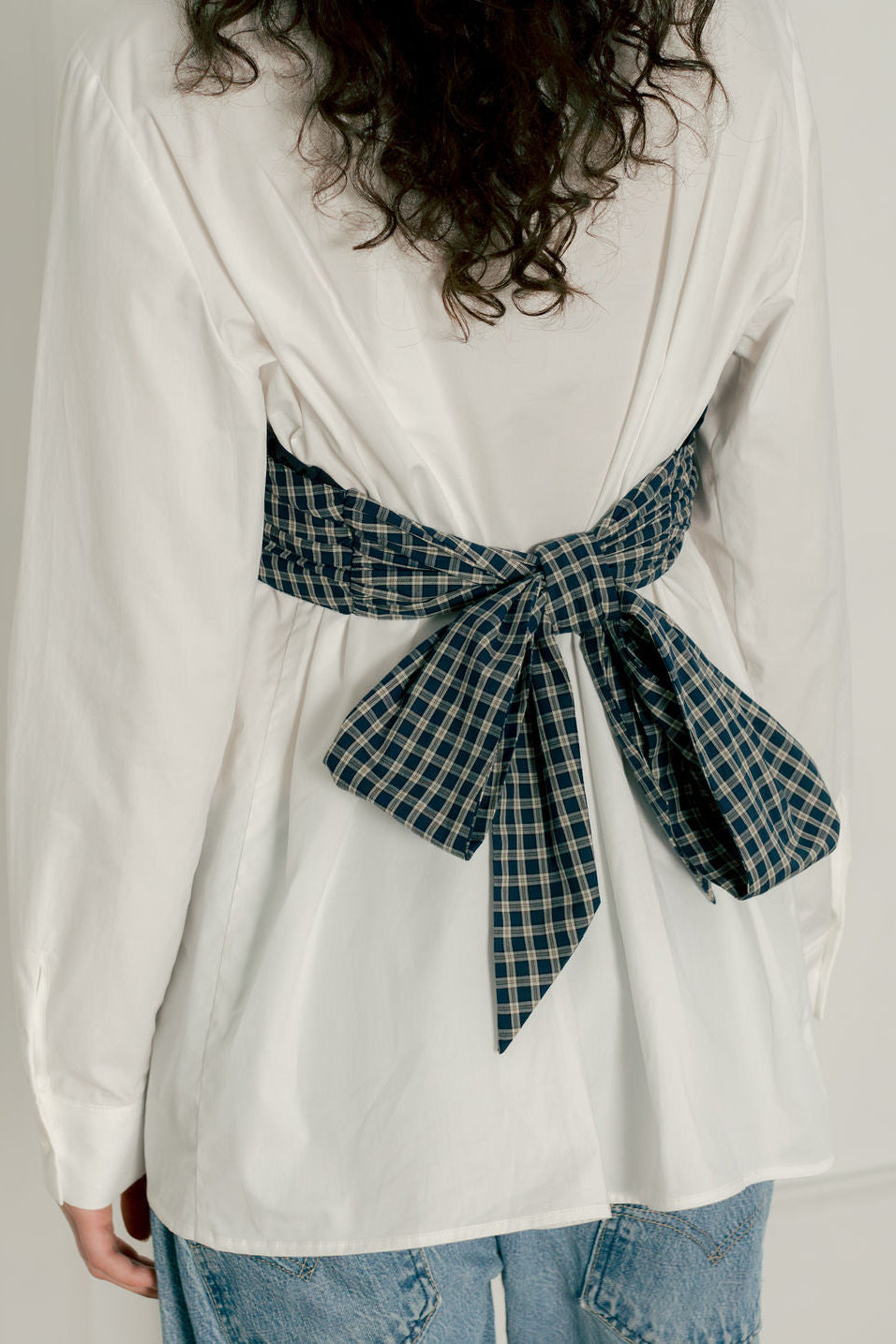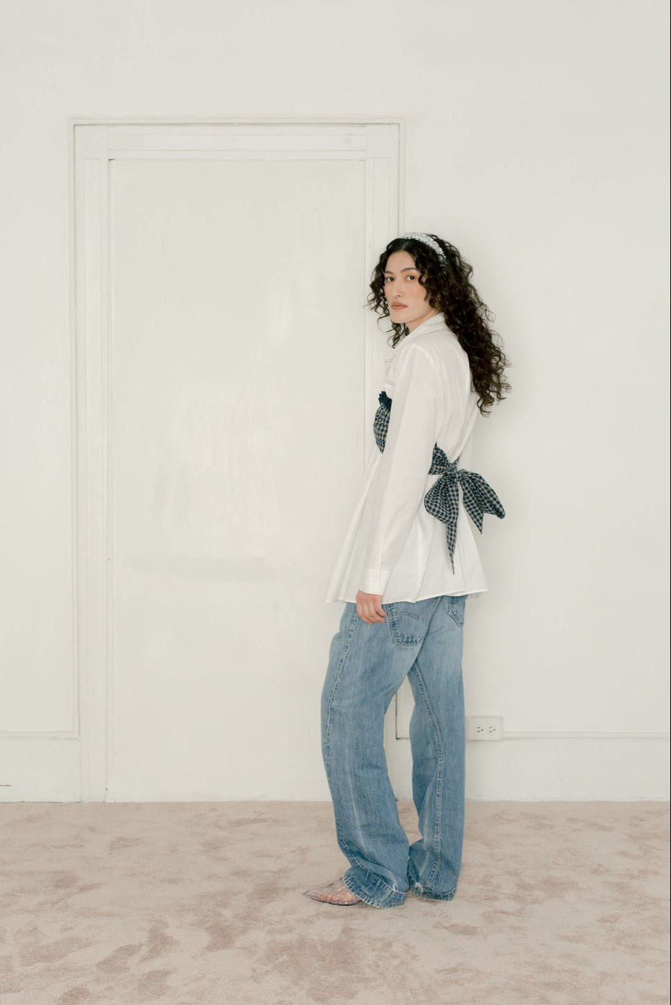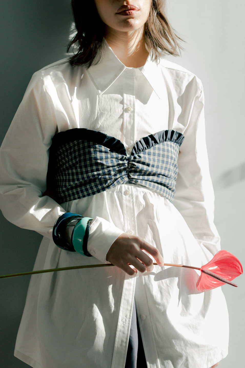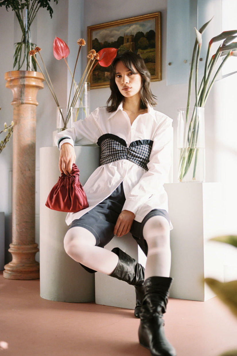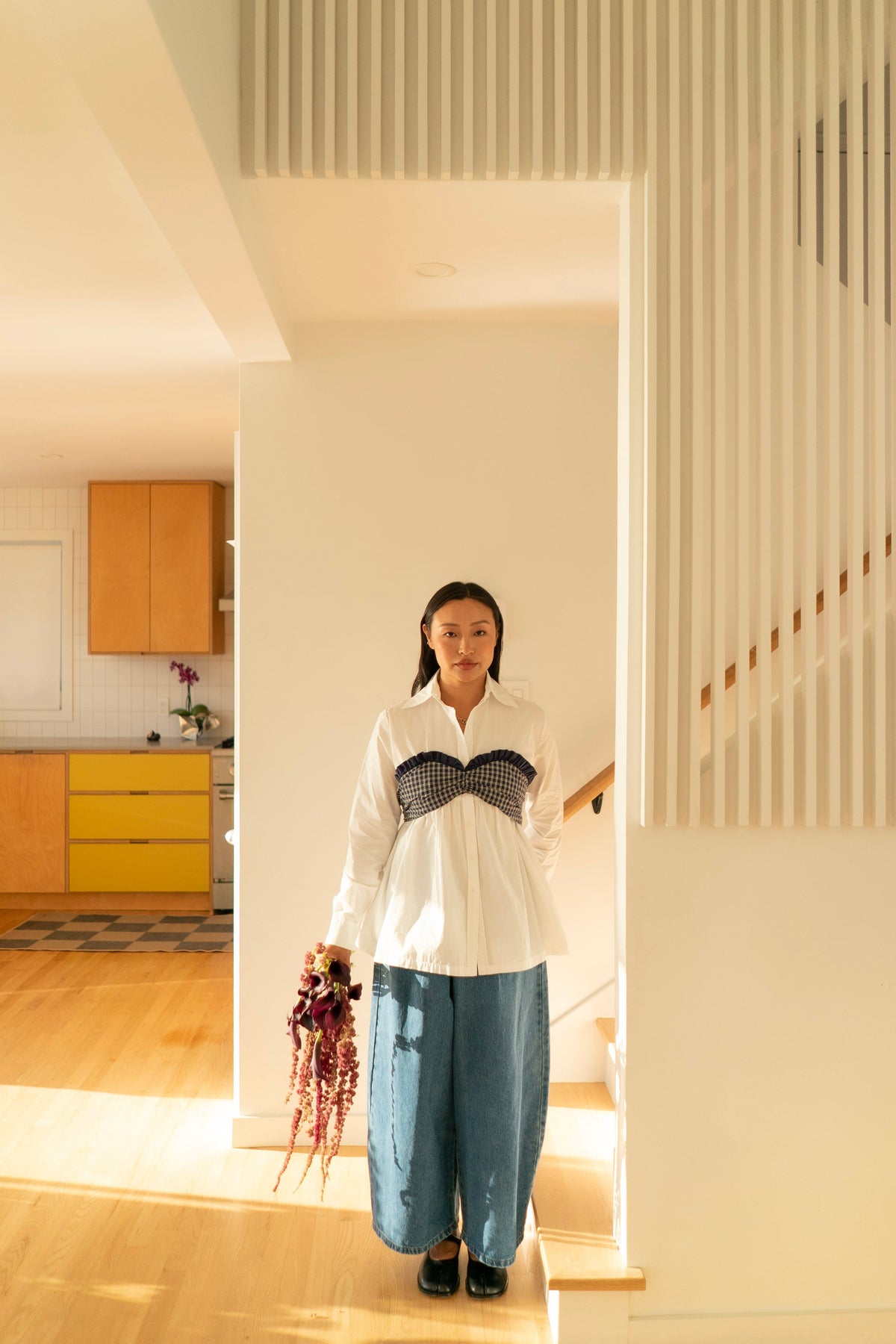 Tia is 5’9 and wears, Shell/Carter Plaid in size Small