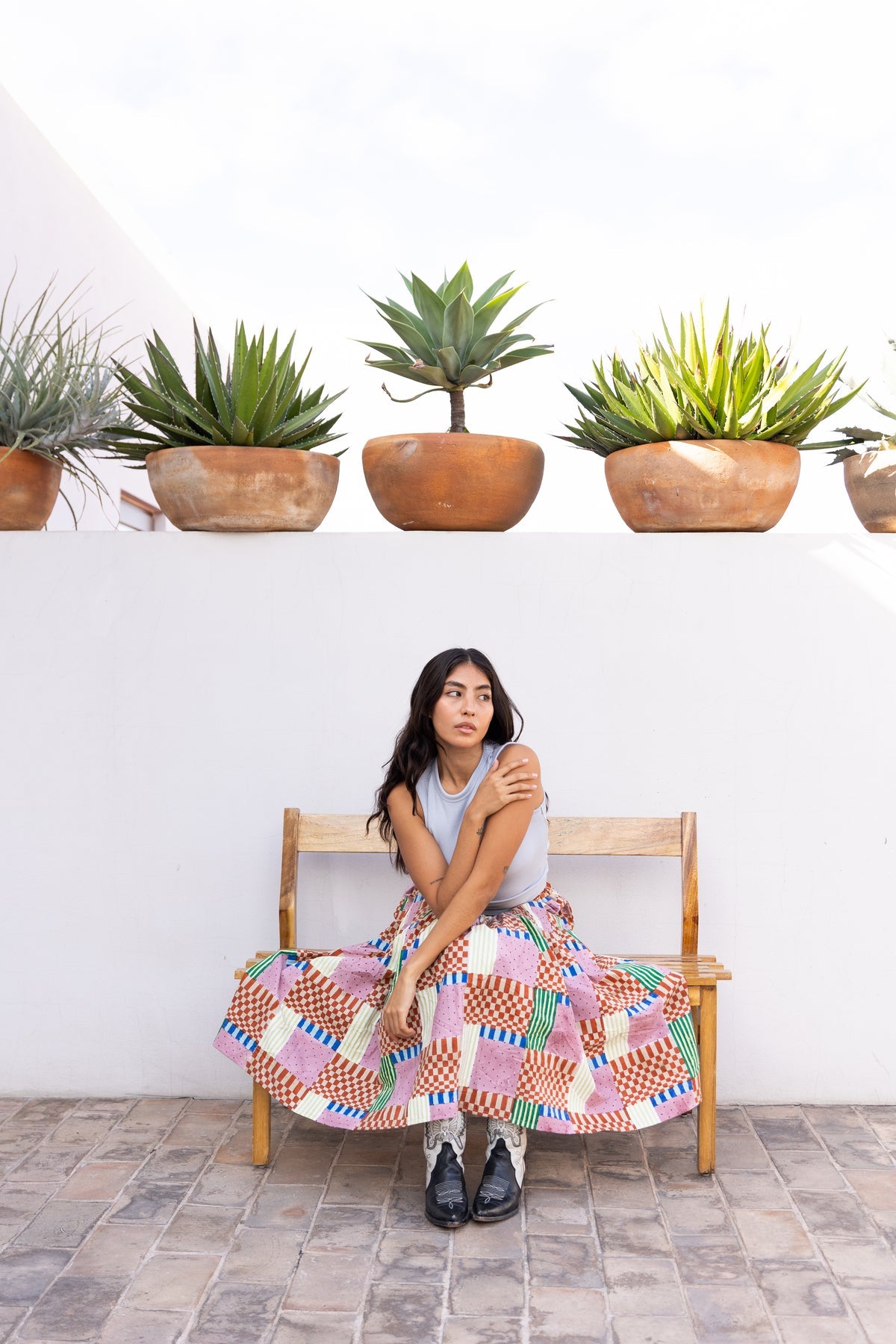 High-waisted, midi-length skirt designed for a flattering and versatile silhouette. Hand blockprinted patchwork-inspired print with vibrant checks, stripes, and geometric motifs in a bold multicolor palette — red, pink, green, blue, and cream.