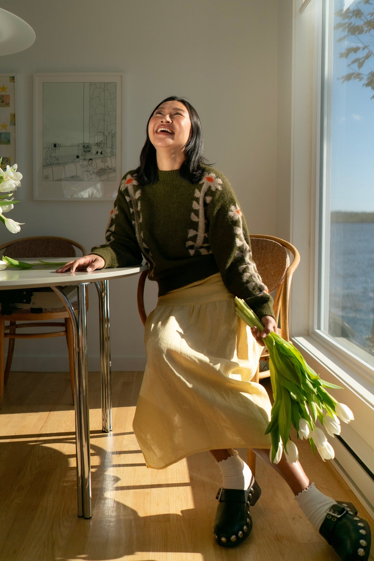 I know I'm not supposed to have favorites... but if I did have one, it would be this Degen knit sweater. Seriously warm but comfortably light- she features flowers inspired by traditional Americana quilt motifs.