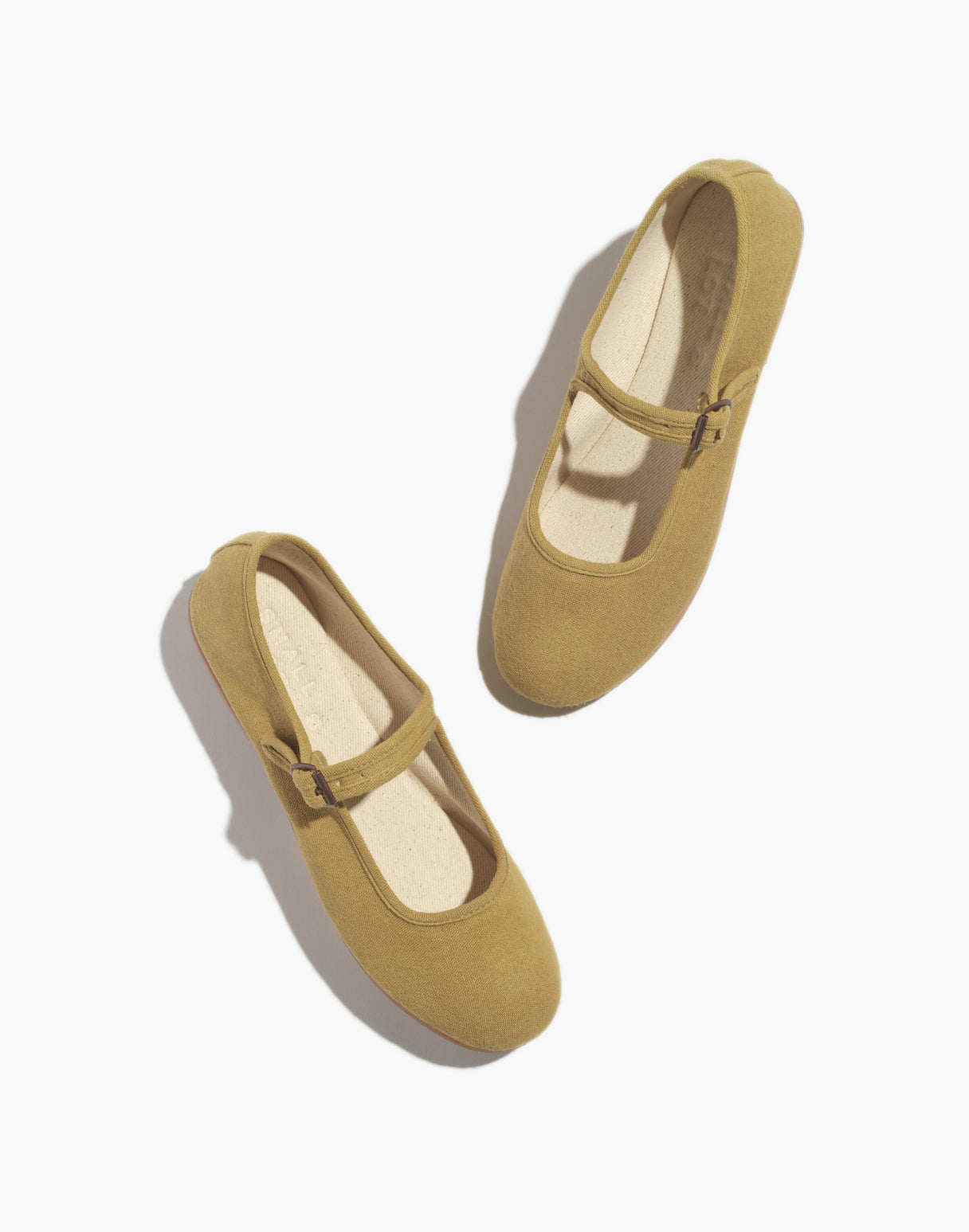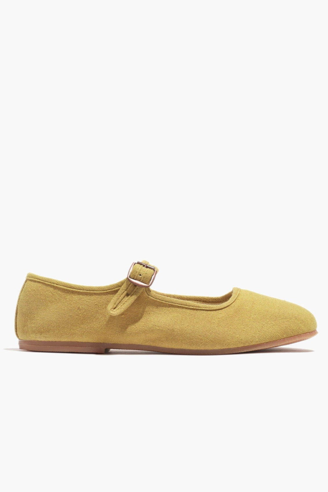 The Classic Mary Jane features premium up-cycled and organic cotton canvas, hand dyed and a natural rubber sole. Details include a small stitched heel and adjustable antique brass buckle.