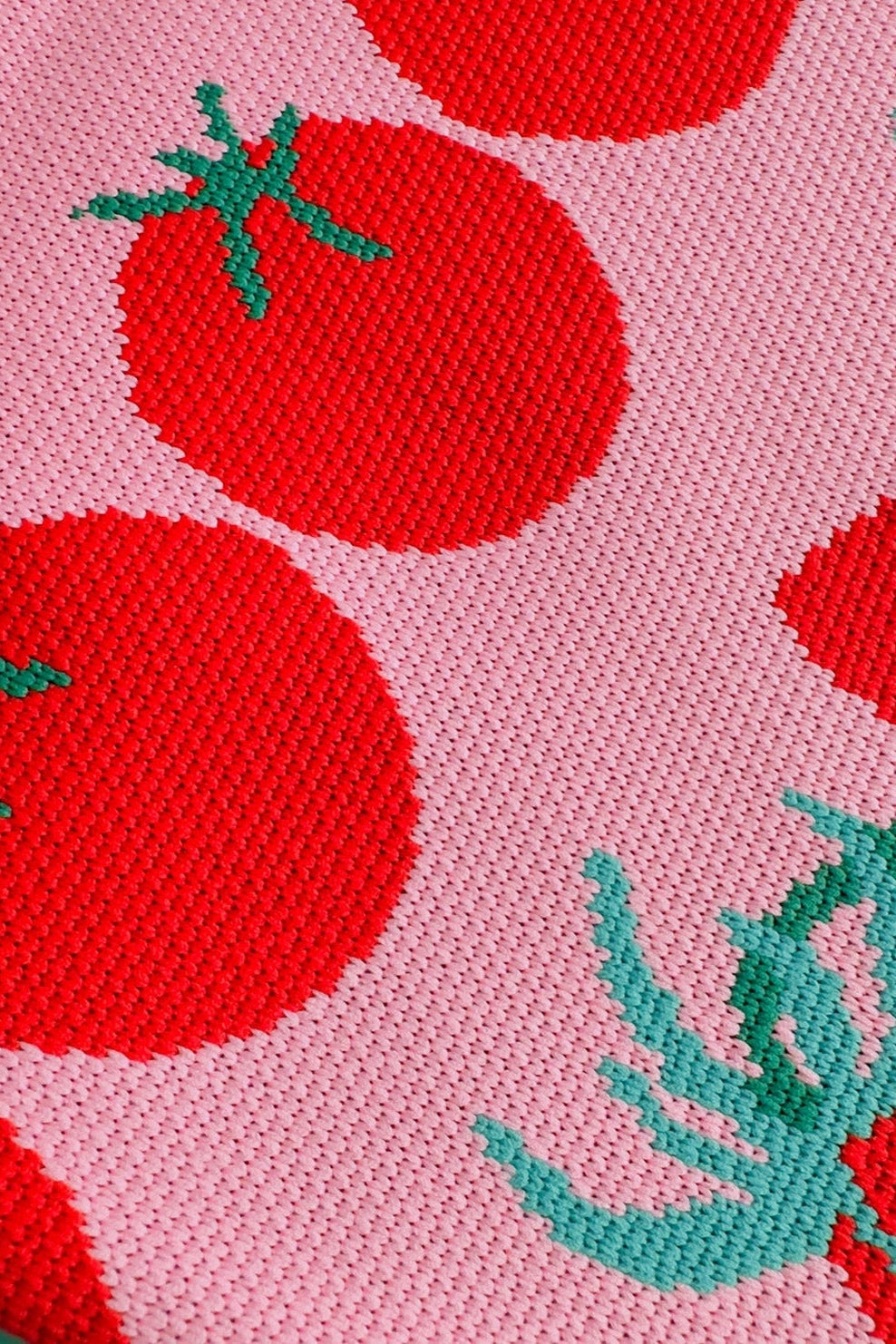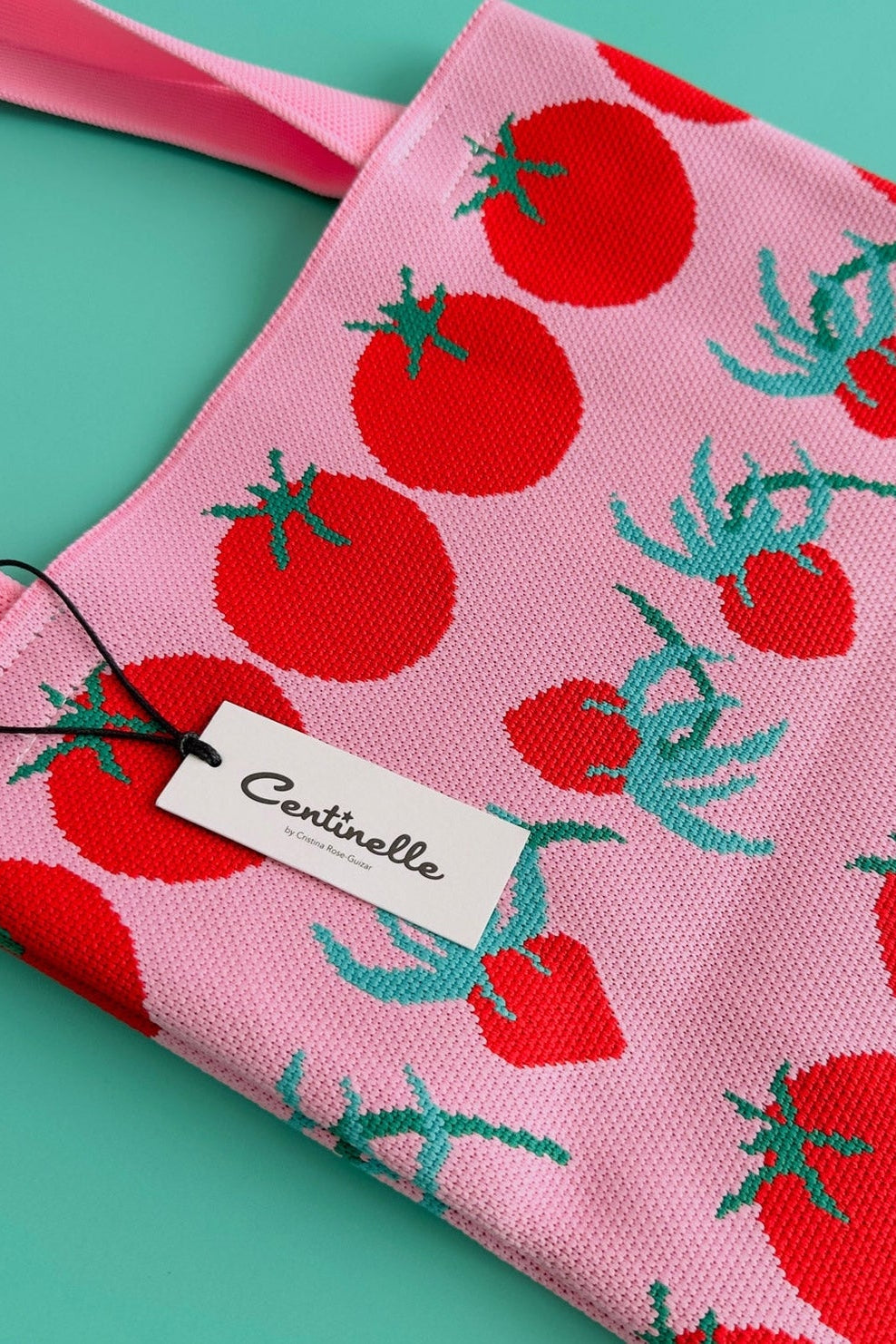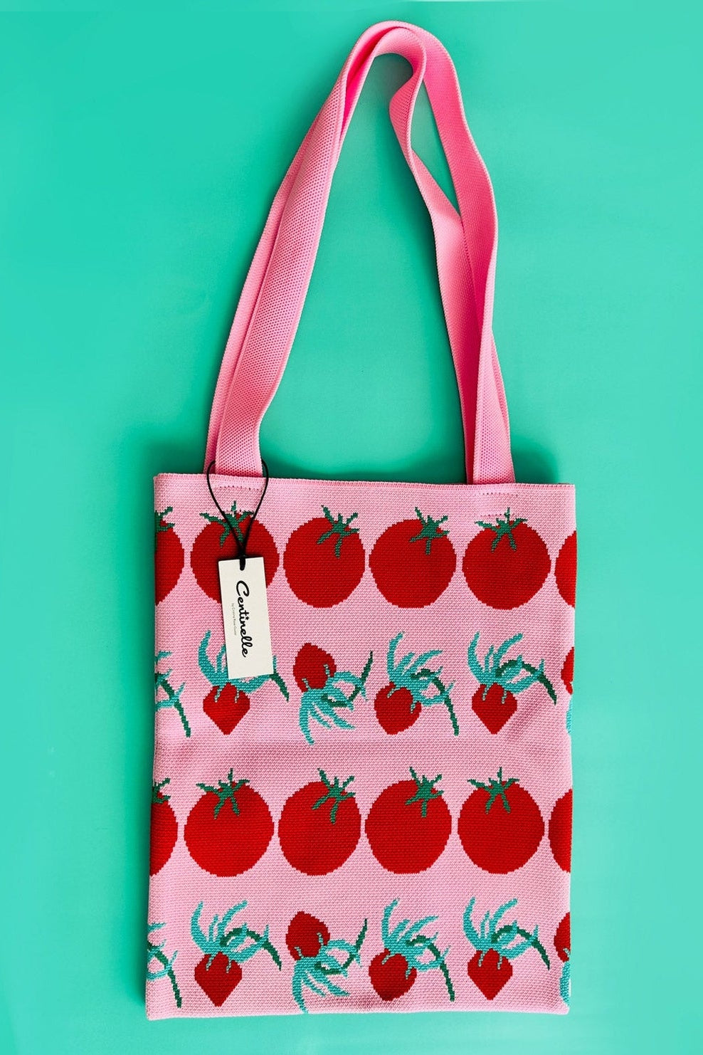 Market fresh tomatoes, all year round! This tote is sewn from a polyester knit in the punchiest pink and red.