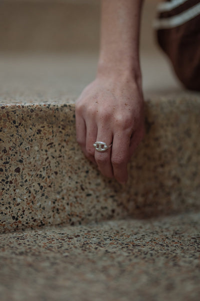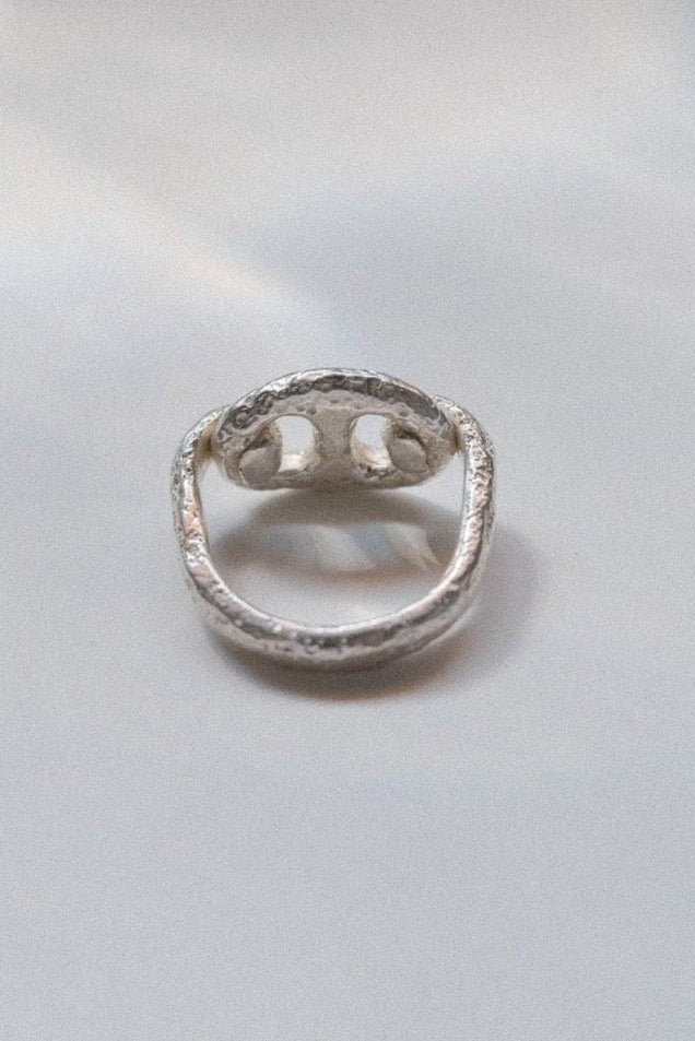 Inspired by a rusty old Mariner chain found at the bottom of Sarah's street by the Halifax Harbour. This ring has a timeless quality and is meant to last many lifetimes. The u-shank band is cast in sand and hooks around the mariner link, utilizing the functionality of the link which is the strongest type of link.