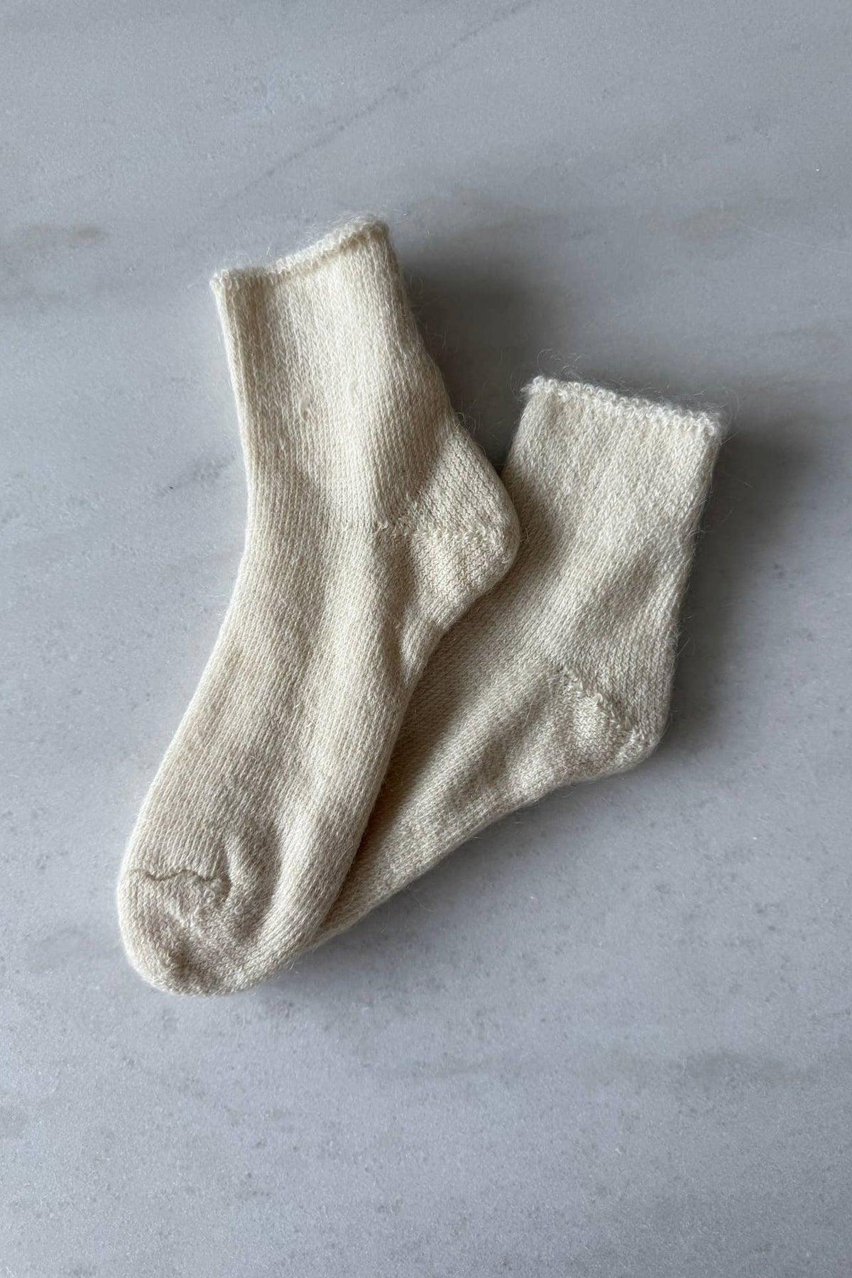 A seasonal speciality sock knit in small batches in Toronto from luxurious, Italian-spun mohair yarn — left completely natural and undyed. Mohair’s long, silky fibres create a beautiful subtle halo and deliver exceptional warmth without weight, making these socks feel airy, soft, and quietly elevated. Lined with a plush terry-knit for gentle padding and softness.