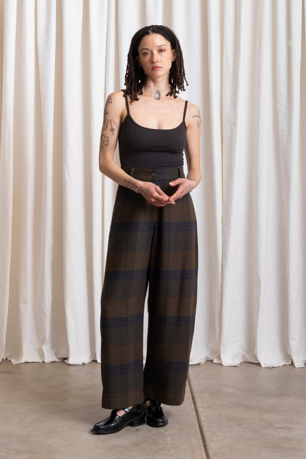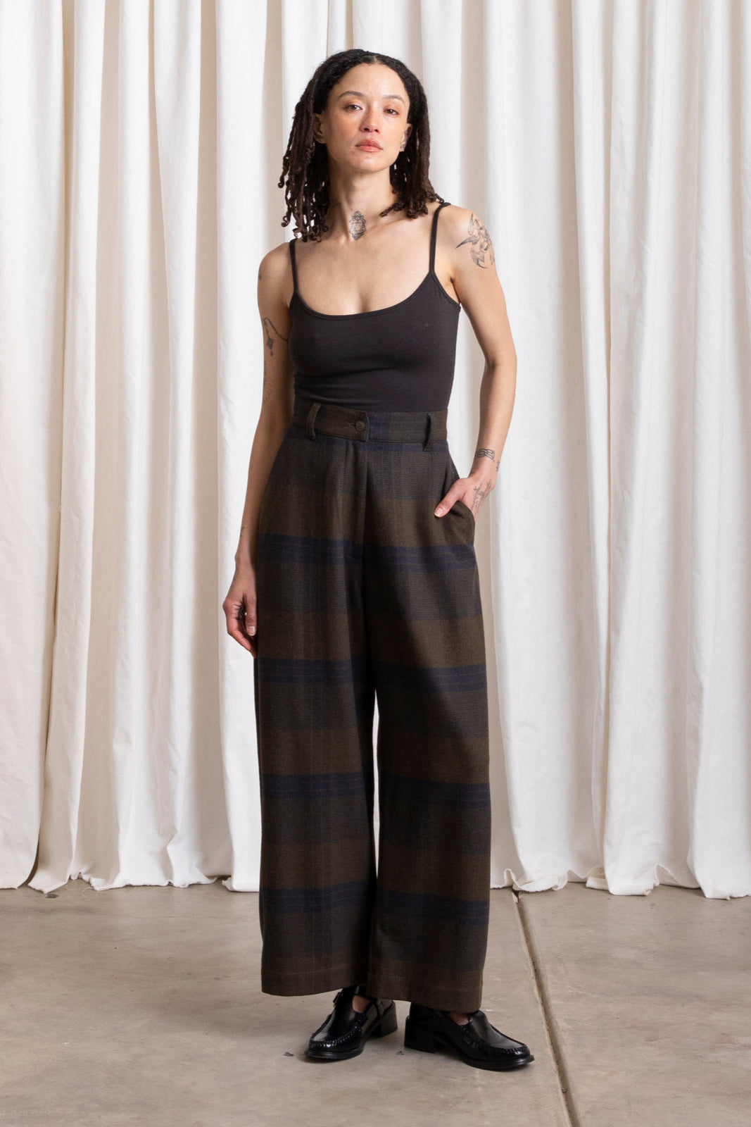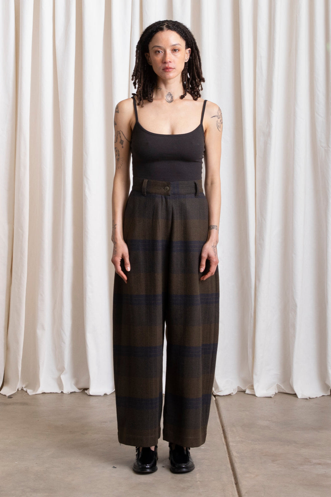 Wool pant with fly-front zip, button waistband closure, front hip pockets and barrel leg. Fully lined.